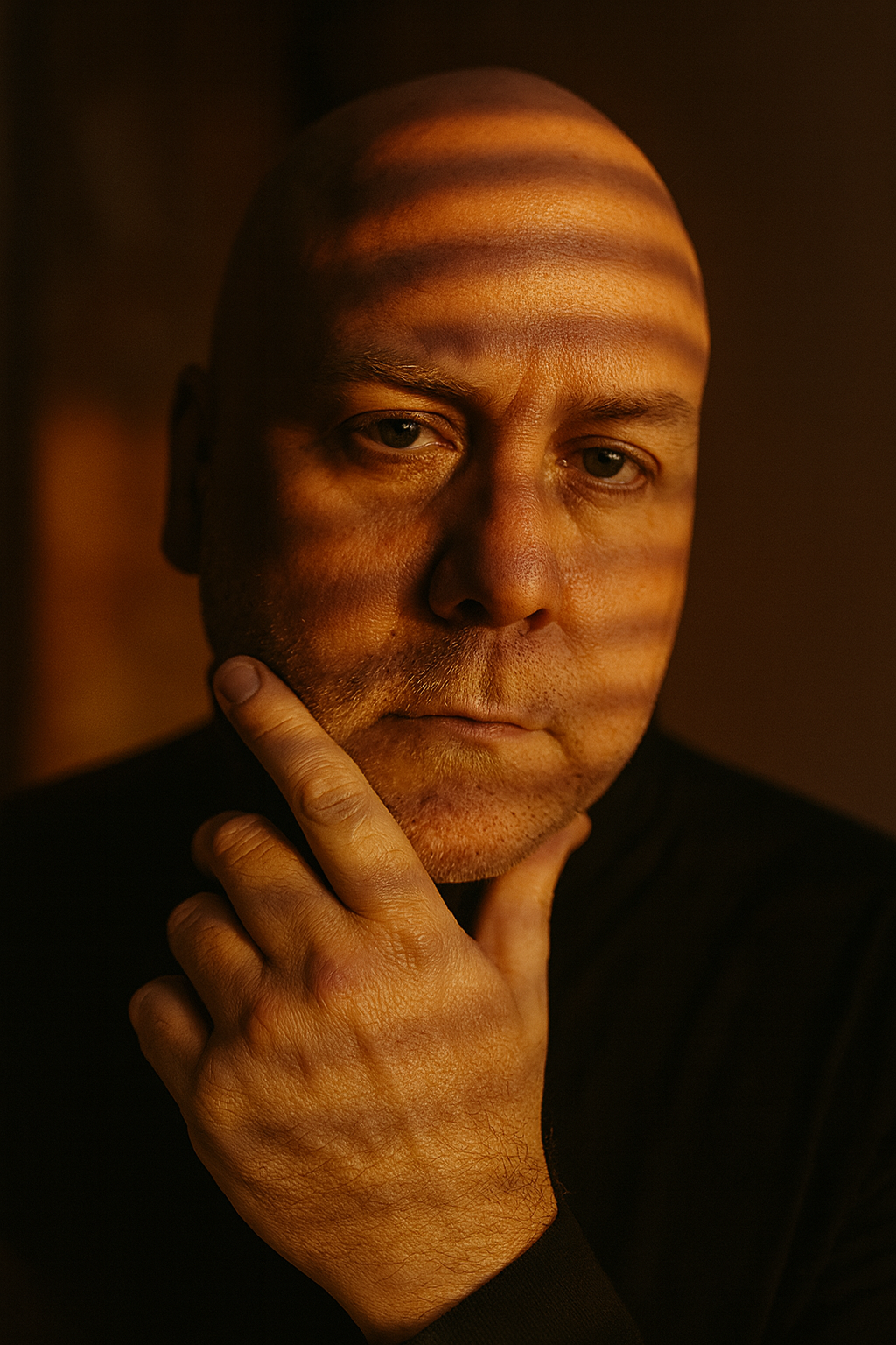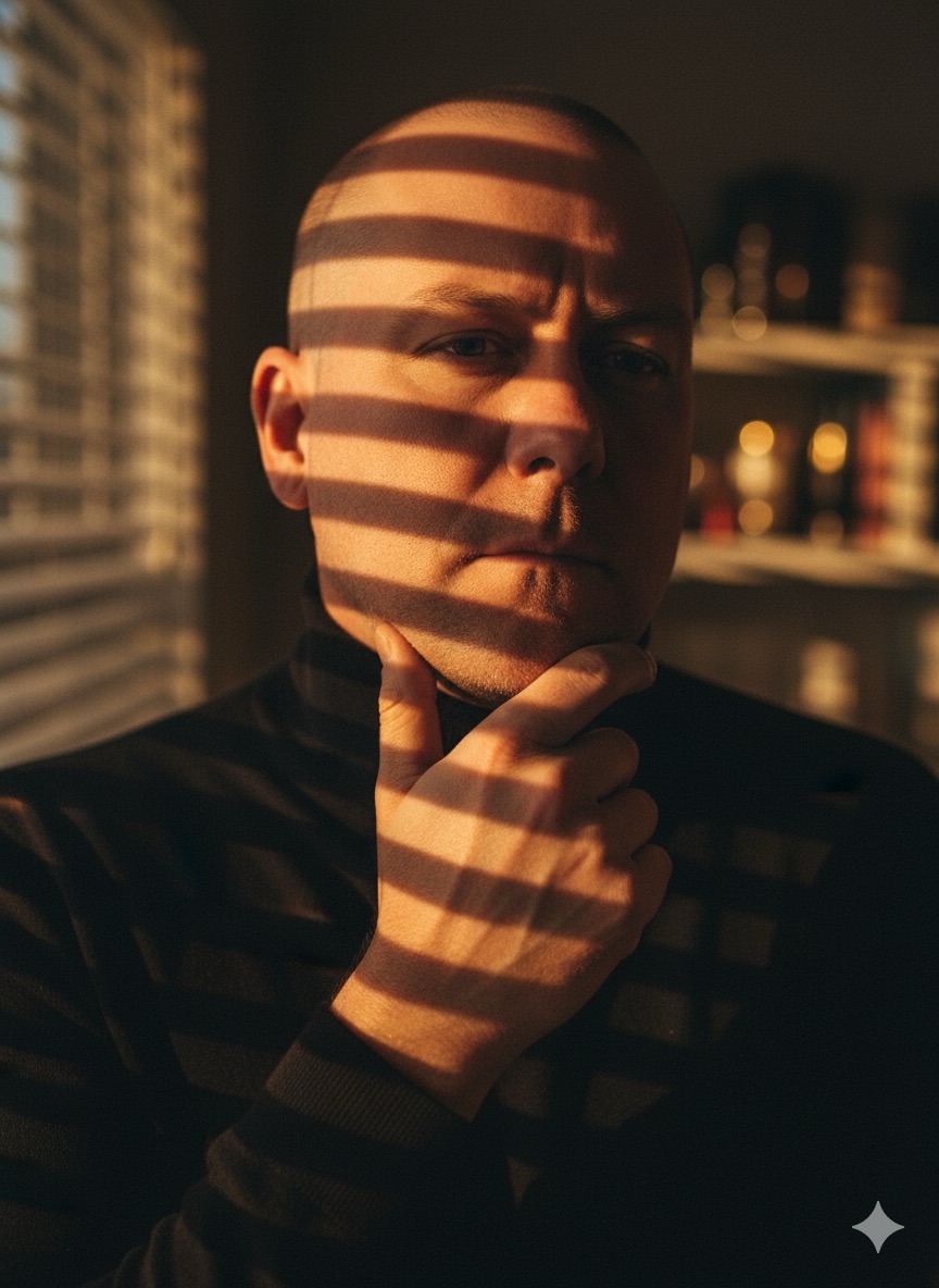 Hyper-realistic photographic portrait of a adult indoors at dusk. Warm sunlight slices through window blinds, casting narrow light-and-shadow bands across the face. Bust/close-up at a three-quarter […]