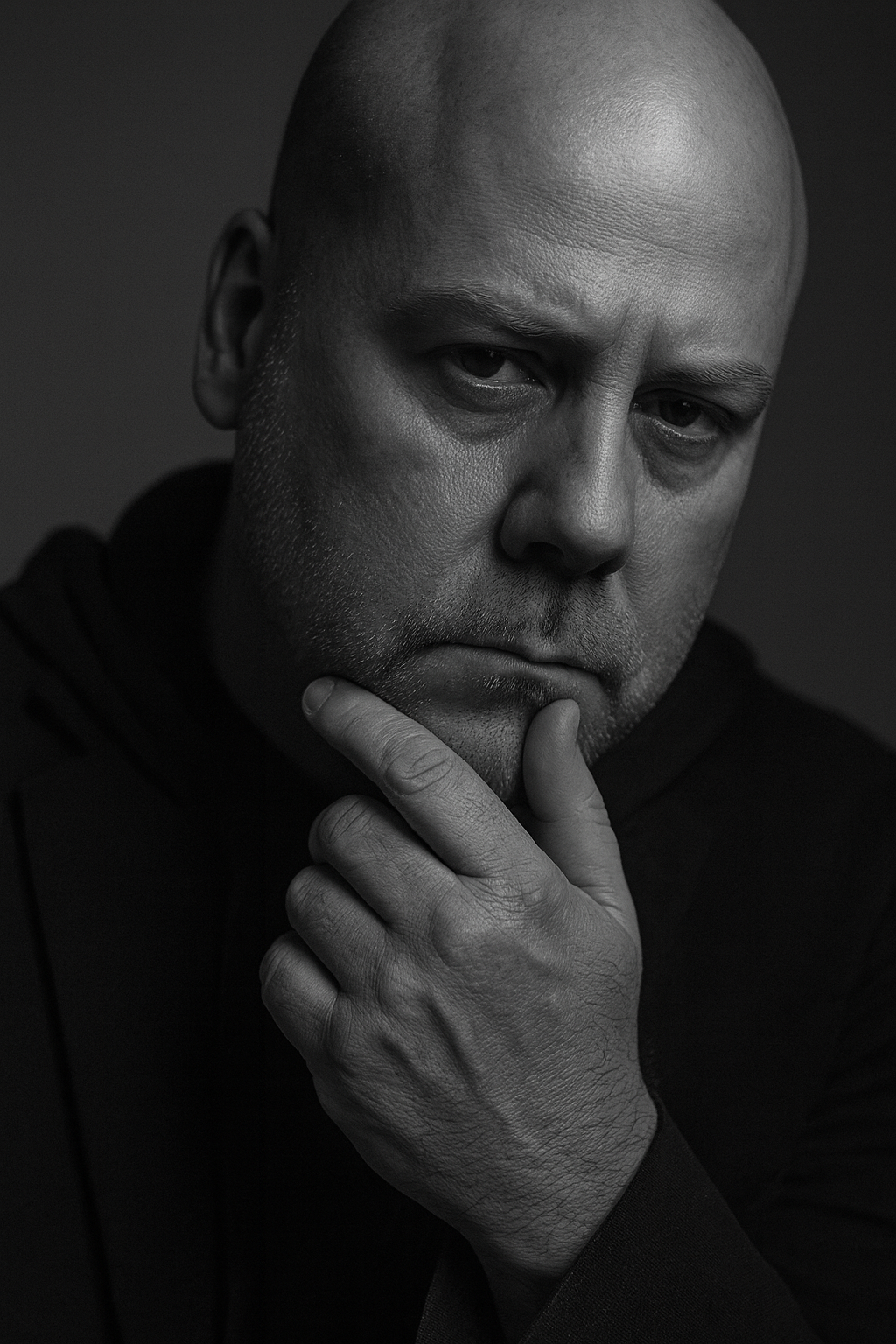 Hyper-realistic minimalist black-and-white vertical portrait (9:16) of a man (based on the uploaded reference). His pose conveys intensity and mystery, with a subtle, natural gesture such […]