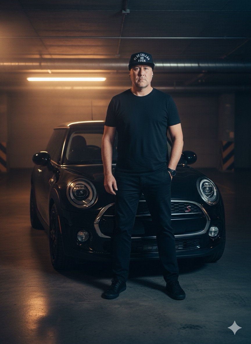 Hyper-realistic cinematic editorial portrait of the uploaded person (preserve face100%). He poses with relaxed authority beside a sleek black Mini Cooper in a luxury underground garage […]