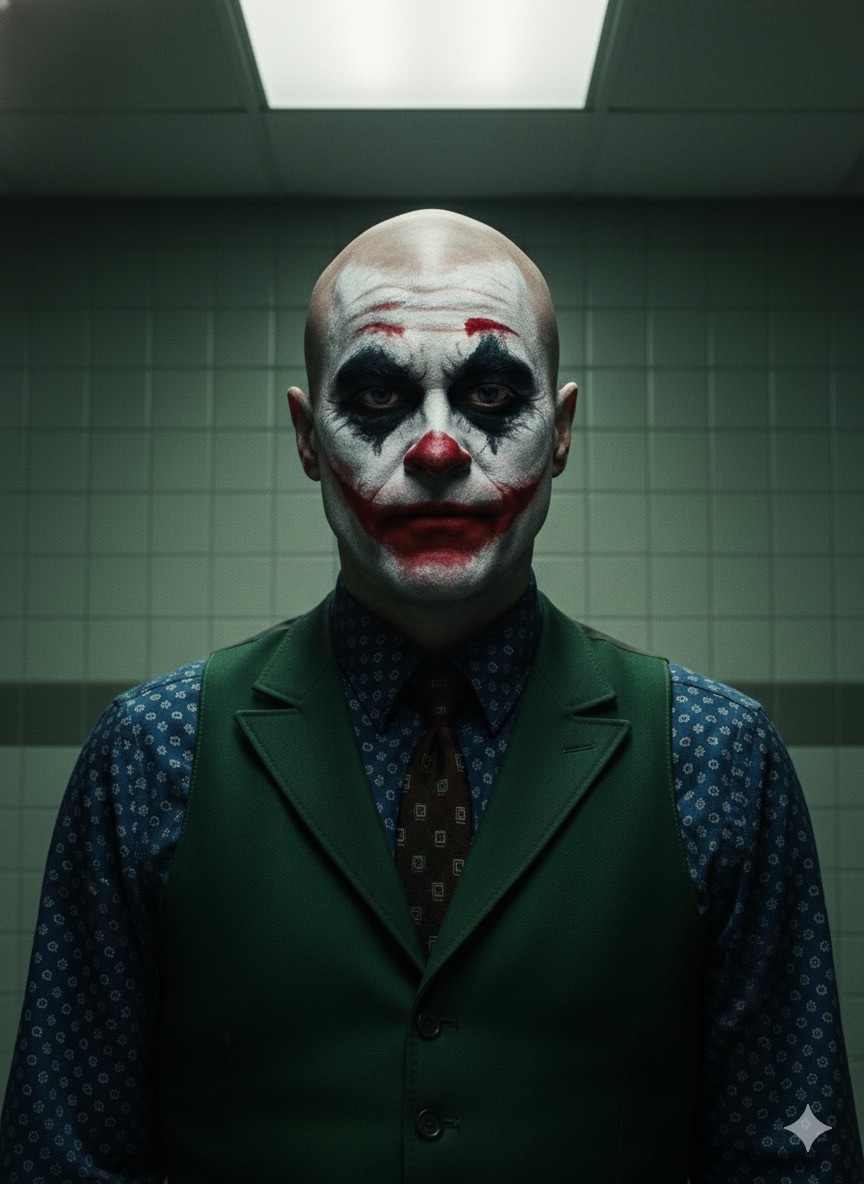A hyper-realistic cinematic portrait of a chaotic villain inspired by Heath Ledger’s Joker, standing in a dimly lit interrogation room with pale green tiled walls. He […]