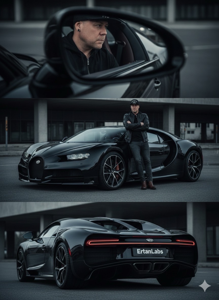 A cinematic automotive photoshoot of me, keeping my real face unchanged. The scene is composed of three perspectives:Interior close-up: I am sitting inside the car, visible […]