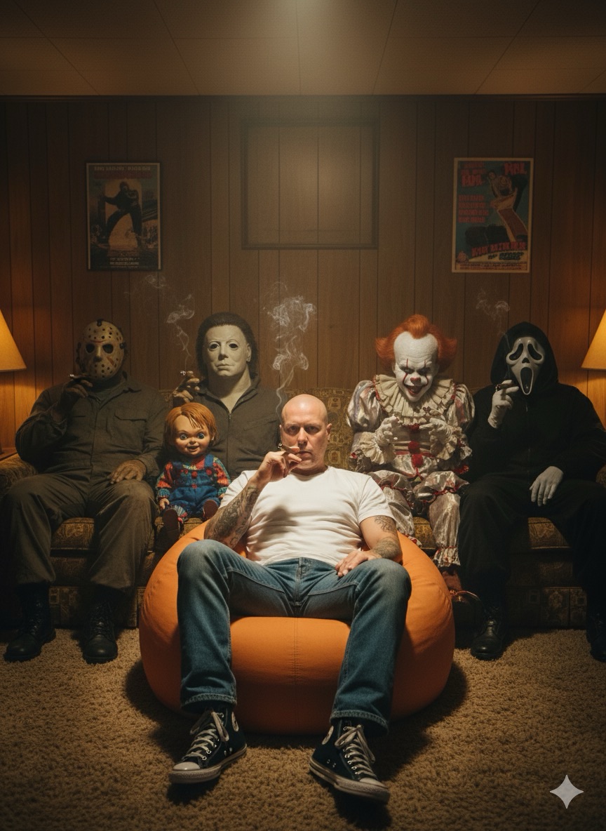 A cinematic photo of a me sitting on a bean bag holdinga cigar in a circle surrounded by famous horror movievillains:Jason Voorhees, Michael Myers, Chucky,Pennywise the […]