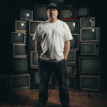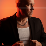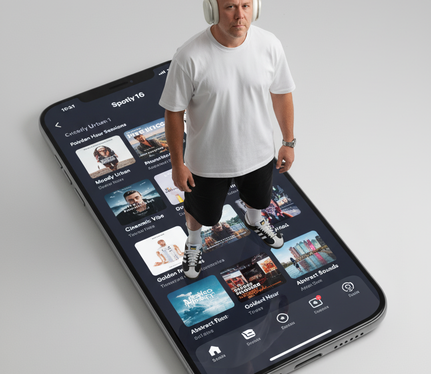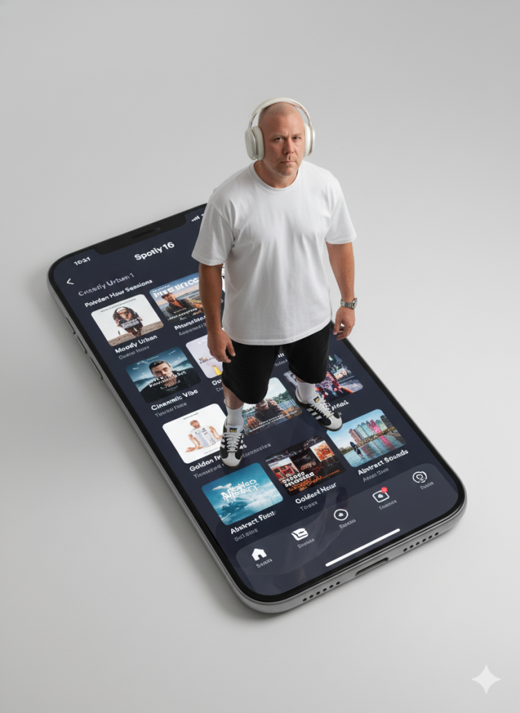 November 12, 2025A stylish photo of me (uploaded photo as reference) as a male model with a shaved bald head, standing on a giant iPhone 16 screen showing a Spotify playlist (uploaded photos). He wears