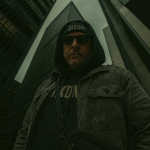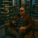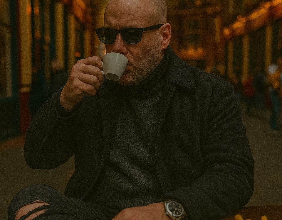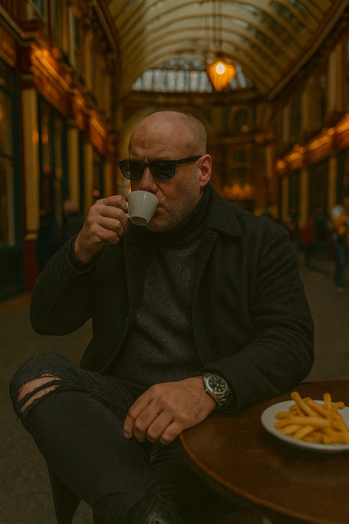 A young man sits casually at a cafe table in Leadenhall Market, London. He has fair skin and is engrossed in drinking espresso, his lips just touching the rim of the cup, his gaze focused downwards. His left hand rests on the table, showcasing a wristwatch. He’s wearing a dark gray turtleneck sweater layered under a thick black jacket, distressed black skinny jeans, black sunglasses in eyes and black Doc Martens. His legs are crossed comfortably at the ankles. The table holds a small plate of french fries. The bustling Leadenhall Market surrounds him; shoppers fill the background, their forms slightly blurred. Overhead lights illuminate the scene, casting a warm, inviting glow. shot during golden hour, the lighting is soft and natural, creating a cinematic portrait with a shallow depth of field sharply focusing on the man. The overall mood is relaxed and contemplative. Professional portrait photography style, 85mm film look. 8k resolution.