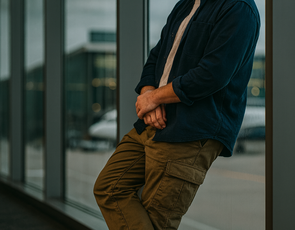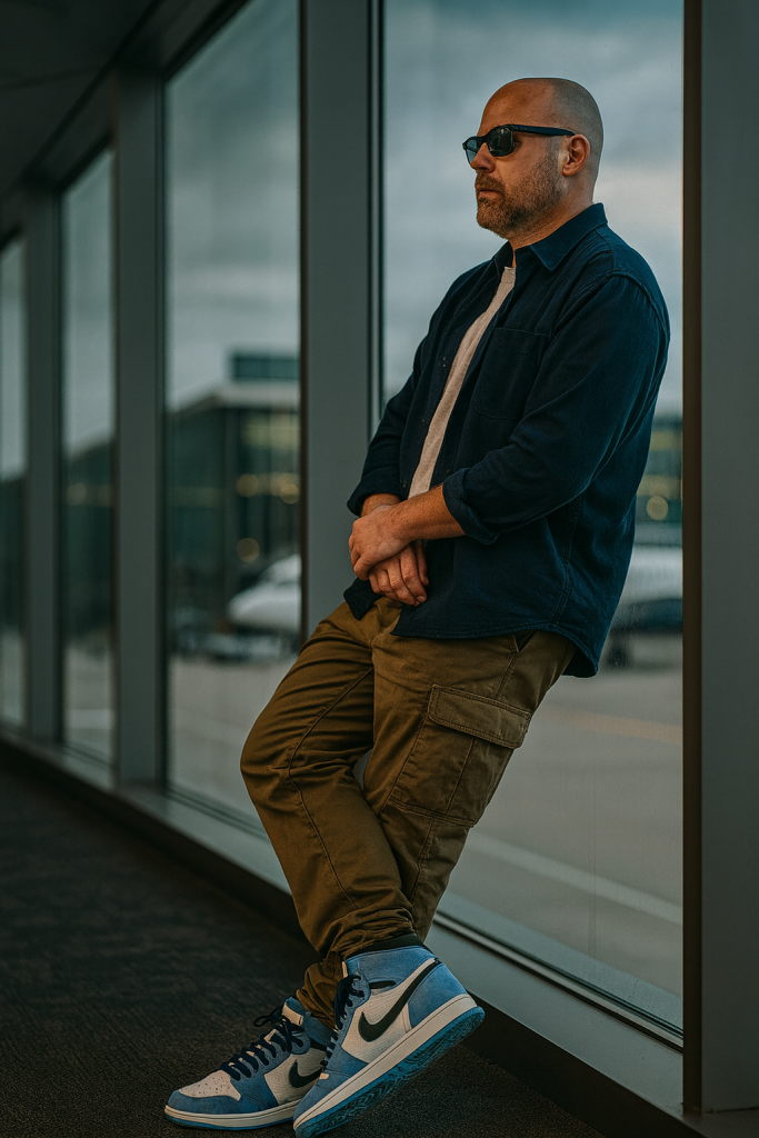 Cinematic low-angle, full-size side-profile vertical portrait of a young man travel influencer (use reference image) casually leaning against the glass window of an  airport lounge. He’s wearing black sunglasses, a dark blue overshirt jacket layered over a white T-shirt, sleeves rolled up to the elbows, paired with relaxed-fit cargo pants and Nike Jordan University Blue high-top sneakers. 8k.