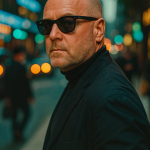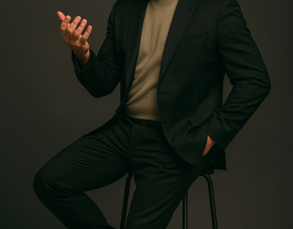 A full-body portrait of me, keeping my exact face, and facial features unchanged. I am sitting sideways on a tall black stool with one leg bent and resting on the stool's lower bar while the other leg extends forward, foot firmly on the ground. My back is straight but slightly relaxed, with my right hand resting casually in my trouser pocket. My left arm is bent at the elbow, with my hand open and slightly tilted upward, as if I am tossing and balancing a small red apple in the air above it. My gaze is directed straight toward the camera, with a confident yet relaxed facial expression. I am wearing a slim-fit black suit with a tailored jacket and matching black trousers, paired with a beige turtleneck sweater underneath. The textures are smooth, elegant, and refined, with a matte finish. My footwear consists of polished black leather dress shoes with a slight shine. The style is modern, minimalistic, and sophisticated, with no accessories except the clean, sharp tailoring of the outfit. The lighting is studio-like, evenly illuminating my figure against a plain, neutral dark gray background, with soft shadows on the floor for depth. The camera angle is eye-level, straight on, with a portrait lens look around 85mm focal length, creating natural proportions and a slightly compressed perspective. The composition captures me entirely in frame, centered, with the apple floating as a dynamic accent. same face