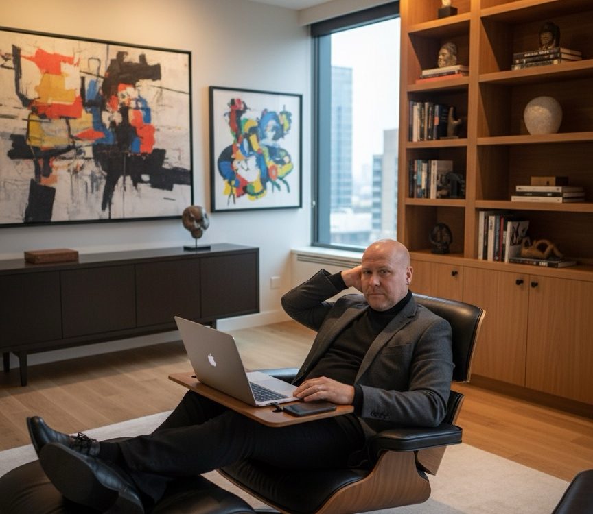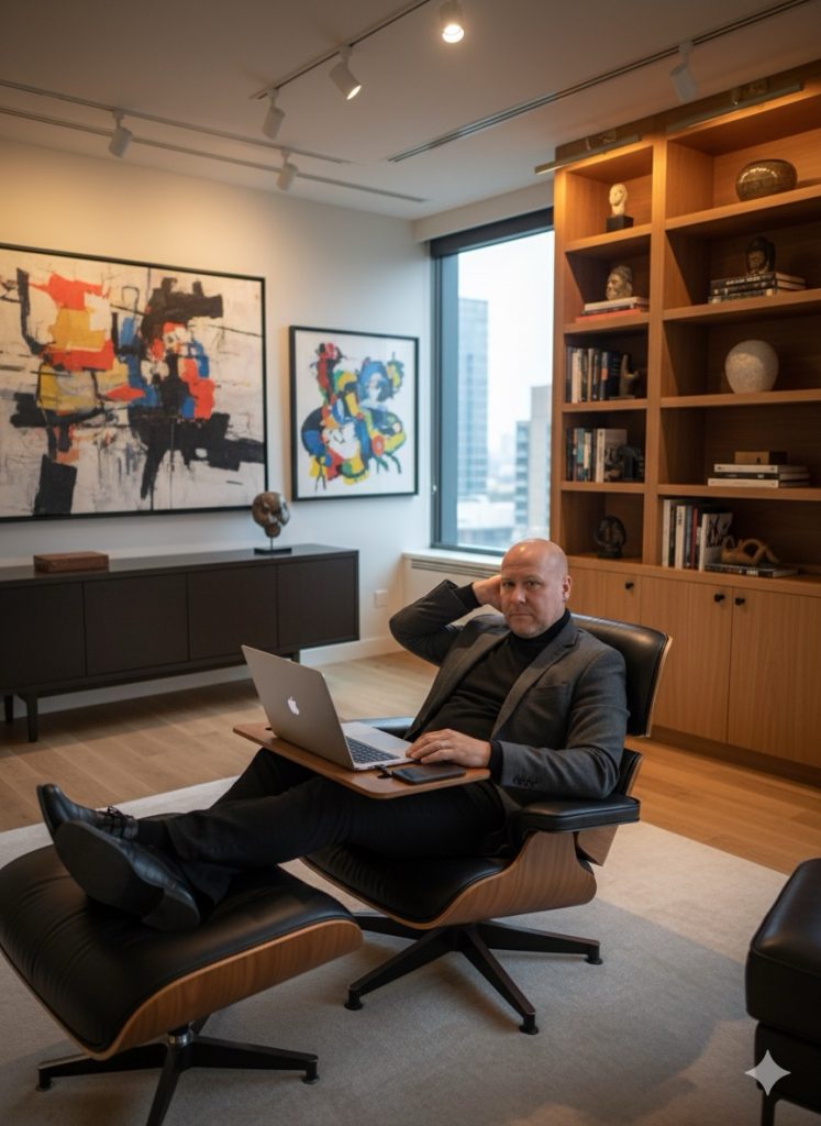 September 7, 2025Entrepreneur in an art-filled commercialsuite, reclining slightly in a leather Eames chair with MacBook on a lap desk, ambient lighting from modern fixtures, one hand restingbehind his head and the other on the trackpad, relaxed yet focused pose, charcoal blazer over a turtleneck, shot fromabove to capture depth of room and luxury details, Canon