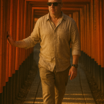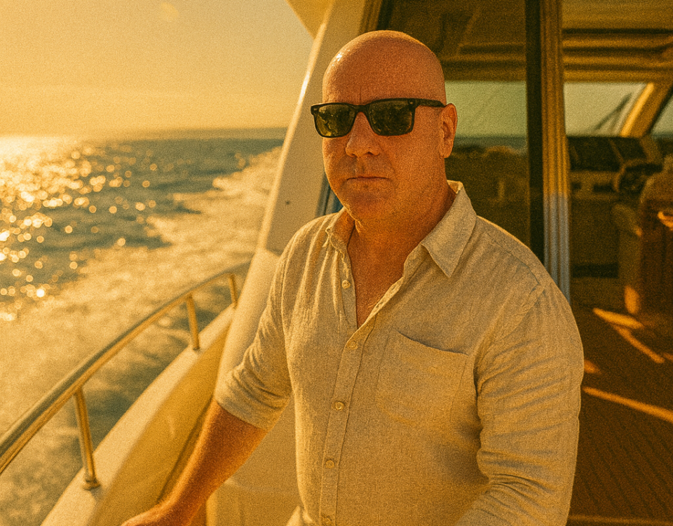 Cinematic wide shot of me standing confidently at the helm of a luxurious white yacht cruising through calm blue waters. I’m wearing a light linen shirt slightly open, black sunglasses. The sun is shining brightly, sparkling on the waves, with a distant coastline barely visible on the horizon. White wake trails behind the yacht. The interior reflects luxury—teak deck, chrome details. 35mm film aesthetic, warm tones, slight lens flare, shallow depth of field, focused on me. same face, shaved head, bald, clean cut.