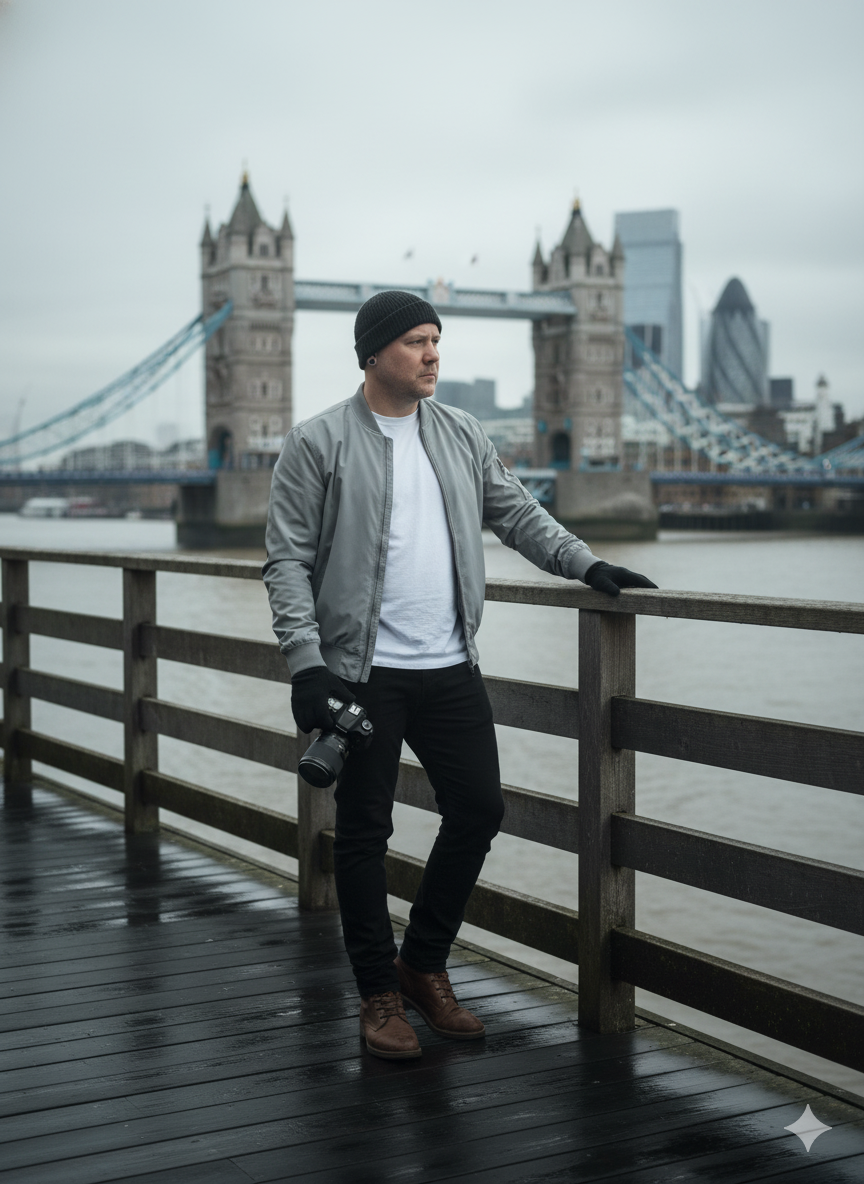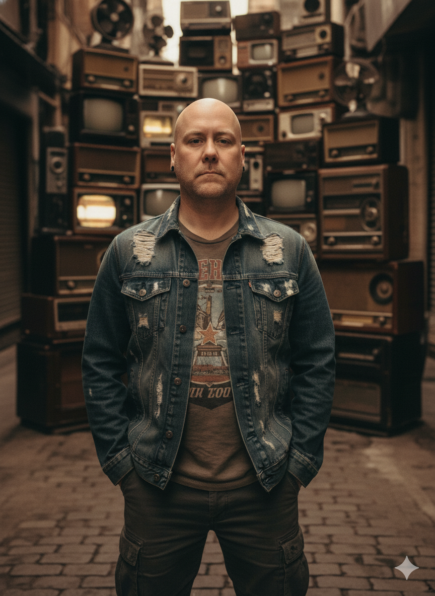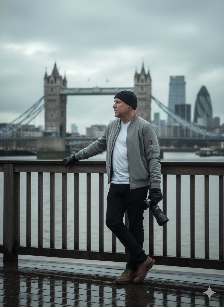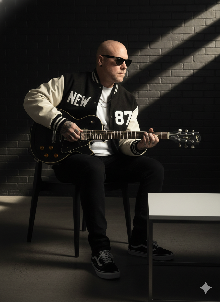 A moody urban portrait of the same person from the reference image with identical facial features, Shaved Bald head , Clean cut, same face and skin […]