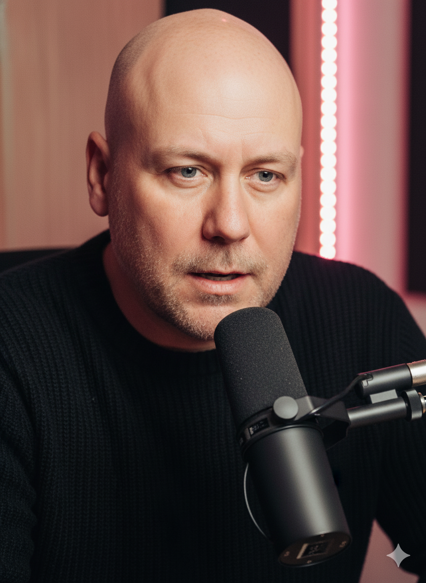 Extreme close-up of a charismatic man with a clean-shaven head, speaking directly into a professional podcast microphone. The background is softly blurred with warm acoustic paneling […]