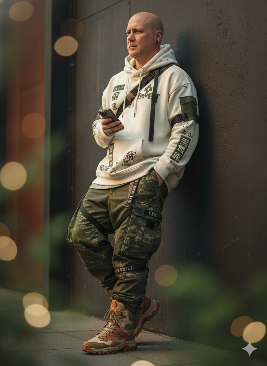 Ultra-realistic 8K portrait. Male subject wearing techwear/cyberpunk aesthetic: Top: Oversized off-white technical hoodie with military green graphics, Asian typography patches, distressed finish, drop shoulders, tactical cross-body […]