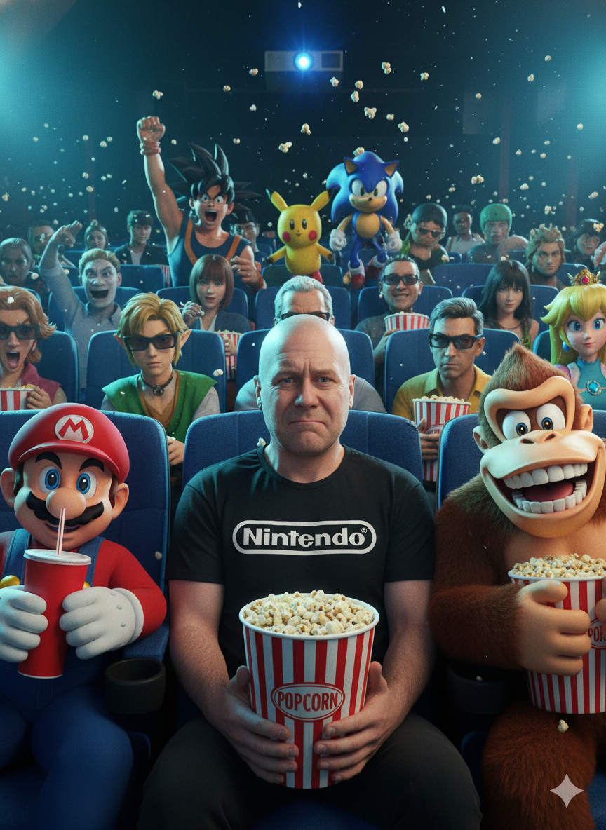 "A hyperrealistic cinematic shot inside a dark movieexaggerated."theater with visible blue seats in the backgroundfilled with various video game characters havingfun. The main character, a man […]