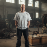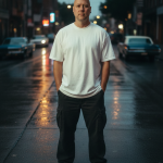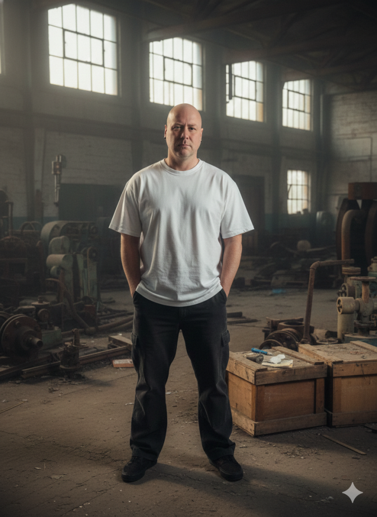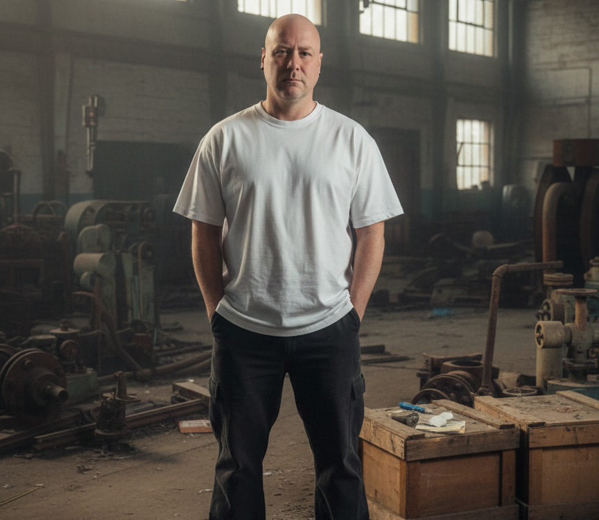 A moody, urban portrait of me standing under a desolate concrete overpass, the harsh architectural lines framing a lone figure. I'm wearing an oversized white t-shirt and loose dark pants, hands in pockets, a relaxed posture. The ground is rough, textured concrete, with hints of dampness. Cinematic top lighting with deep shadows and rich texture, emphasising the starkness of the environment. Shot on 35mm, f/2.8, ISO 400, 1/125s. Apply Fuji Classic Chrome preset with warm highlights, strong contrast, slight desaturation, light film grain, and soft vignette for a nostalgic, non-blue tone look. Don't change the face. (Use the attached image) shaved bald head, clean cut, same face.
