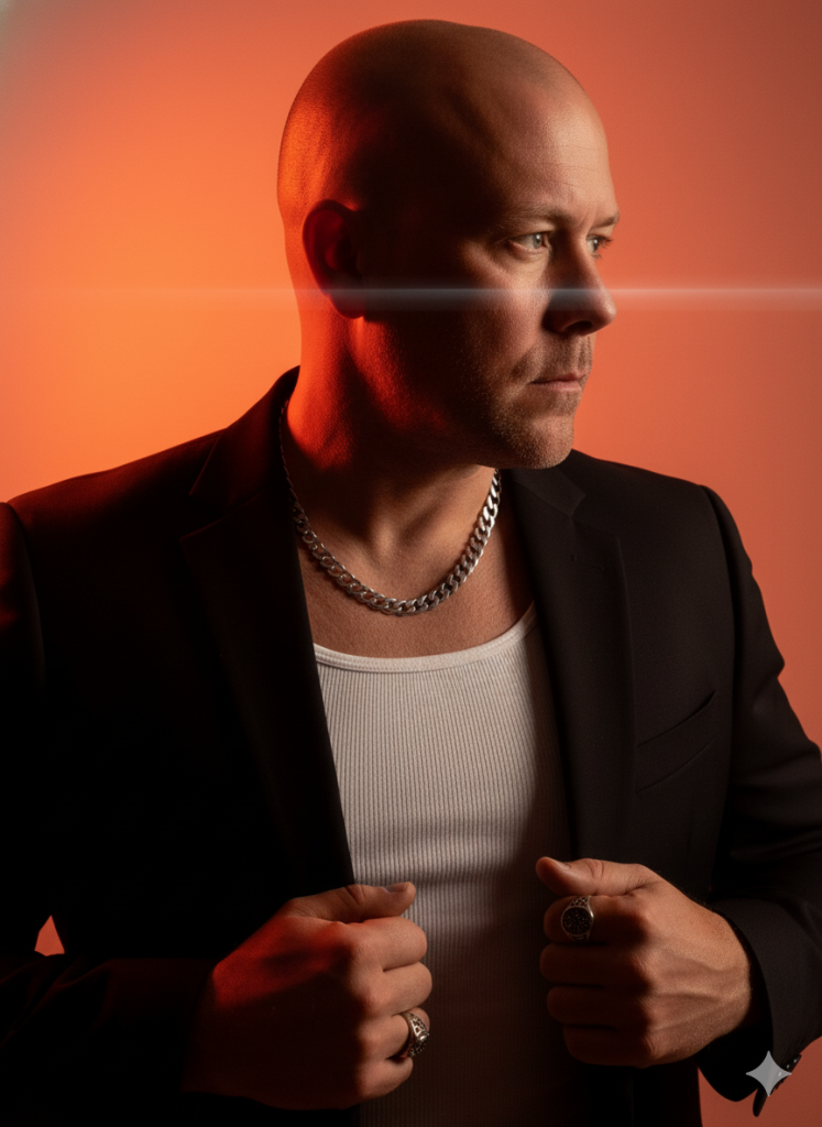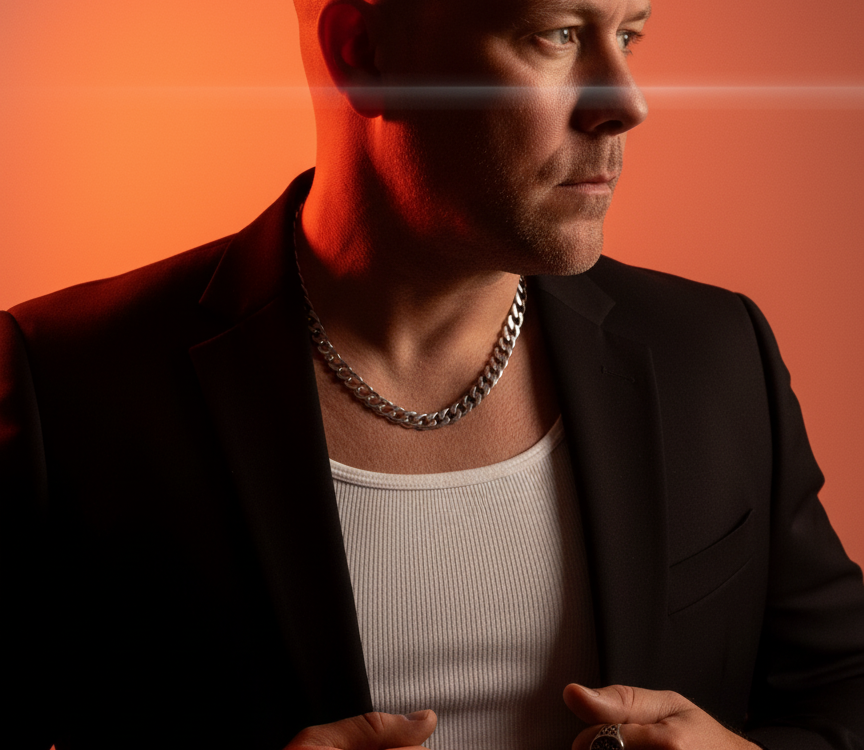 November 12, 2025STYLISH DRAMATIC WAIST-UP PORTRAIT OF A MAN ADJUSTING A DARK BLAZER, HEAD TURNED RIGHT, INTENSE GAZE, WARM HIGH-CONTRAST STUDIO LIGHTING WITH STRONG ORANGE-RED KEY LIGHT ON LEFT SIDE, DEEP SHADOWS ON RIGHT, SOFT GLOWING ORANGE-RED BACKGROUND WITH SUBTLE RIM LIGHT AND FAINT LIGHT FLARE ACROSS FACE, WEARING WHITE TANK, SILVER CHAIN, TWO RINGS, CINEMATIC SHARP DETAIL, FASHION EDITORIAL STYLE, AUTHENTIC FACE PRESERVED.