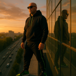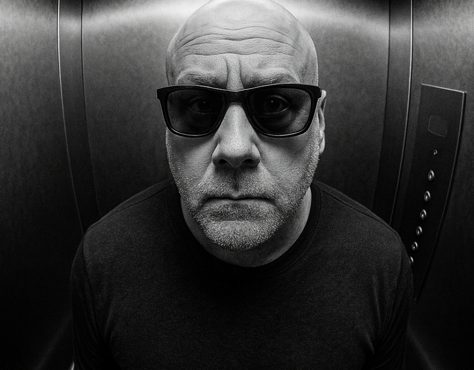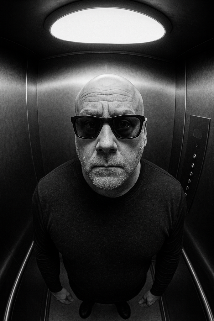 Create an ultra-realistic, high-resolution (8K) black-and-white cinematic portrait inside a small elevator. Replace the original character with my exact face from the provided selfie – no alterations, smoothing, or retouching. My facial structure, beard, and expression must remain fully authentic and unchanged. The photo should be taken from an extreme wide-angle, fisheye-style top-down perspective, as if captured from a security camera mounted on the elevator ceiling. I’m standing directly under a large, glowing ceiling light panel that softly illuminates the entire frame. The lighting should cast subtle shadows on my facial contours, especially on my cheekbones, eyes, and beard, adding mood and depth. I’m wearing a dark, textured long-sleeve shirt or tunic, closely fitting, and black sunglasses. The setting is a metal-walled elevator with a visible panel of buttons on the right side and soft reflections in the elevator’s brushed metal walls. My posture is firm, shoulders back, and arms hanging down naturally by my sides. The mood is intense, raw, and slightly confrontational – I should appear to be looking directly up at the camera with an unwavering, powerful gaze. The final result should replicate the original framing, angle, lighting, outfit style, and elevator setting — but with my body and unedited selfie face in place of the original man. same face, shaved bald head, clean cut.