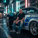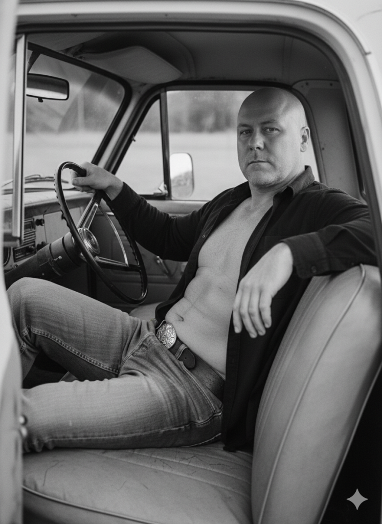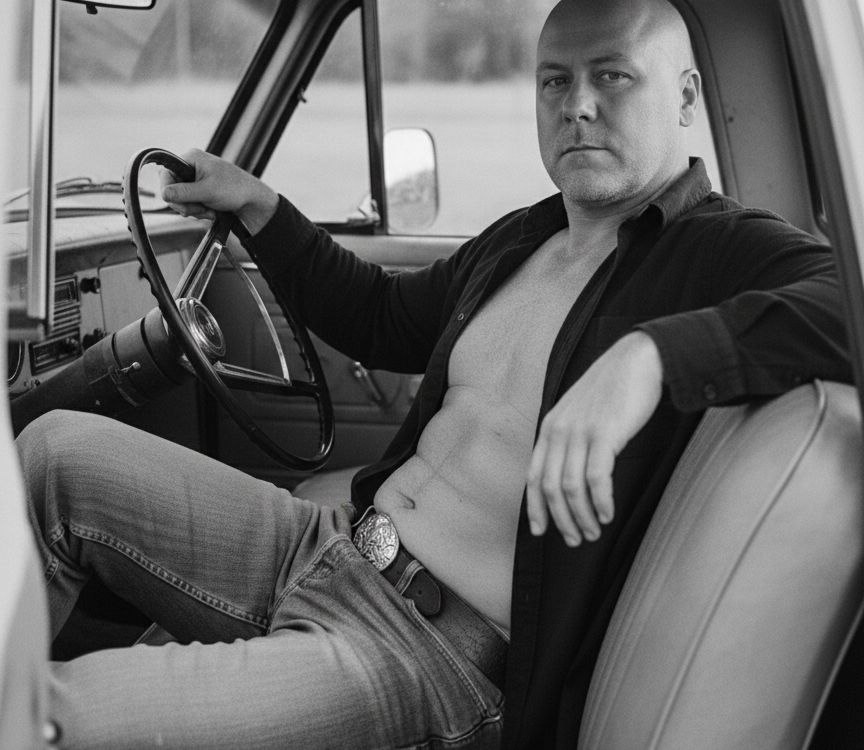 Man (Keep the reference face and body 100%) reclining casually inside an old pickup truck, framed through the open window, creating an intimate and cinematic composition. He sits with legs extended along the seat, one arm draped over the backrest and the other resting near the steering wheel, exuding relaxed confidence and effortless charisma. His shirt is unbuttoned, revealing a bare chest, and he wears worn jeans with a distinctive belt buckle, adding a rugged, masculine touch. The lighting is soft and natural, filtering through the truck's windows to highlight his face and upper body while casting gentle shadows that define texture and depth. Captured in black and white, the photograph combines sensuality and realism with a nostalgic Americana tone. The style evokes Herb Ritts' iconic portraiture - intimate, tactile, and cinematic, blending raw authenticity with refined composition. Clean cut, shaved bald head, same face