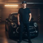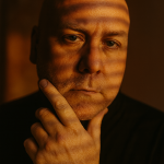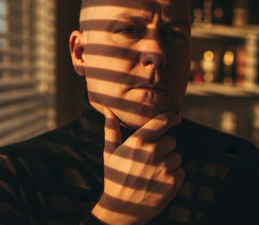 Hyper-realistic photographic portrait of a adult indoors at dusk. Warm sunlight slices through window blinds, casting narrow light-and-shadow bands across the face. Bust/close-up at a three-quarter angle, one hand gently touching the jawline, neutral and introspective expression. Black turtleneck. Background soft and out of focus with cinematic bokeh. True-to-life skin texture with pores and micro-highlights (no airbrushing). Cinematic color grade in amber/golden tones, subtle film grain. Natural anatomy and hands. Portrait lens look (50-85 mm equivalent) with shallow depth of field (about f/1.8-f/2.0). High resolution, clean edges, professional photography quality." Avoid (put inline or as a second sentence): "Avoid cartoon, anime, CGI look, plastic skin, over-sharpening, HDR halos, extra or deformed fingers, warped facial features, noisy or cluttered background, harsh flash." Optional technical hints (safe across engines): • Aspect ratio: 2:3 vertical • Lighting note: single warm key light from camera-left through blinds; gentle falloff • Style note: documentary realism with poetic mood; natural color retention; no excessive retouching, shaved head, same face, clean cut.