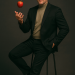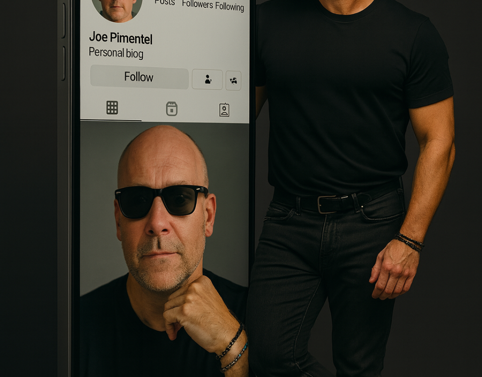 A realistic man with identical proportions to the size of a giant vertical smartphone, standing on the right side of it, showing on the front screen the real screenshot of the user's Instagram profile https://www.instagram.com/pimentelj0e, applied as a sharp, high-resolution texture The exact face from the provided selfie - no editing, no retouching, no smoothing - with natural skin texture, beard, hairstyle, and expression preserved. Wearing a fitted black minimalist t-shirt, dark low-waist jeans with black belt, white Nike sneakers with black accents, a fully black trucker cap (mesh back, worn backwards), Ray-Ban Wayfarer sunglasses with black frames and completely opaque black lenses,  one black bead bracelet and one silver chain-link bracelet. Back leaning against the side of the smartphone, body slightly in profile, gaze directed naturally upward toward the follower count in the Instagram interface. The leg closest to the camera is bent, foot pressed against the phone's side; the other leg extended with the foot resting on the floor, creating a confident, dynamic editorial pose. Background: clean, minimalist dark studio Lighting: soft, diffuse studio light with a frontal or lateral softbox, no harsh shadows, balanced and natural look Technical parameters: simulated 50mm or 35mm lens, f/2.8, ISO 100, 1/125, sharp focus on human figure and smartphone, moderate depth of field, vertical 9:16, 4K resolution. Style: hyper-realistic, editorial-conceptual photography, inspired by Apple campaigns and The Gentleman's Journal, conveying a strong connection between personal identity and digital presence, with perfectly defined facial details, clothing textures and props. same face