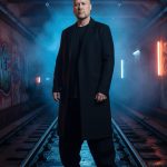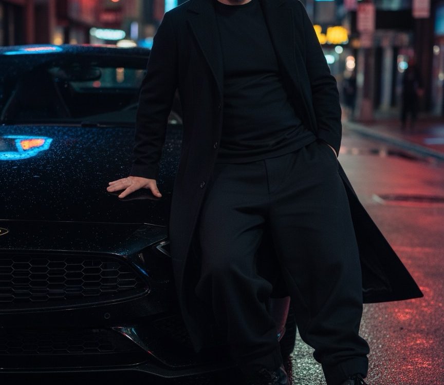 Produce a hyper-realistic image of [attached person photo], fully maintaining their original characteristics. Shaved head bald, clean cut. The person is standing next to a luxury sports car on an urban street at night, illuminated by neon signs. Their pose is firm and confident, with one hand on the car and their gaze directed straight at the camera. The outfit is bold and monochromatic: an open overcoat, oversized trousers, and boots. The atmosphere is cinematic and editorial, with the aesthetic of an international men’s fashion campaign. Shaved head, clean cut, same face