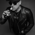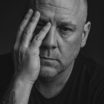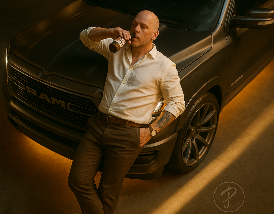 Generate a hyper-realistic 8K photo taken from an overhead high-angle perspective in a 3:4 full-body composition. The subject, lying relaxed on the hood of an orange 2019 Dodge Ram 1500, lowered inside a dimly lit basement garage, wears a crisp white open-collar shirt, brown trousers, polished shoes, and a leather strap watch. A tattoo is visible on his forearm, while soft sunbeam lighting enhances the natural reflections on the car. The image features cinematic warm color grading, shallow depth of field, and creamy bokeh, creating a luxurious, billionaire-style vibe, same face, shaved bald head, clean cut.