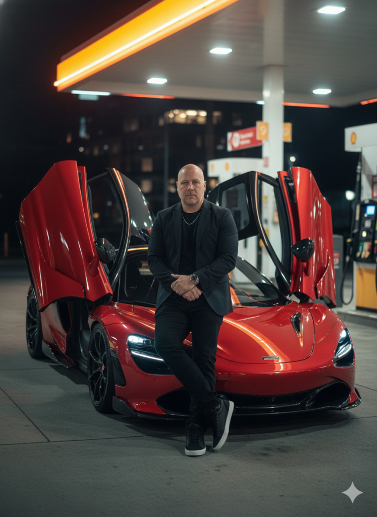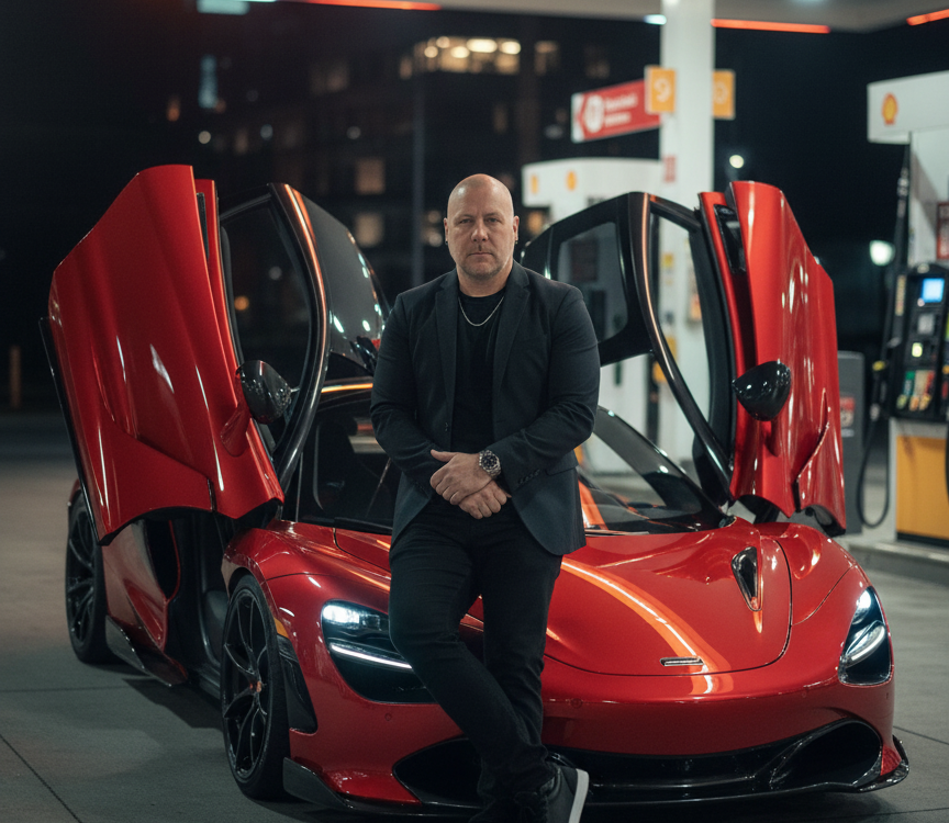 8K ultra-realistic cinematic night portrait of a stylish, handsome man (face 100% identical to reference, unchanged) posing confidently at a Shell gas station under glowing neon lights. He leans casually against a modified red McLaren supercar with scissor doors opens upwards. The car features a sleek, glossy finish, custom wheels, and a lowered body, reflecting the ambient station lights on its polished surface. The man wears modern casual streetwear - a fitted black t-shirt layered with a black jacket, paired with stylish details to enhance his confident urban vibe, shaved bald head, clean cut, same face. Lighting is cinematic with moody highlights, neon reflections on the car's body, and dramatic shadows that enhance depth. The background shows the glowing Shell station lights with a vibrant, urban night atmosphere, slightly blurred for depth of field (bokeh). Camera details: 85mm lens, f/1.4 aperture, shallow depth of field, crisp subject focus, ultra-detailed textures on face, outfit, and car