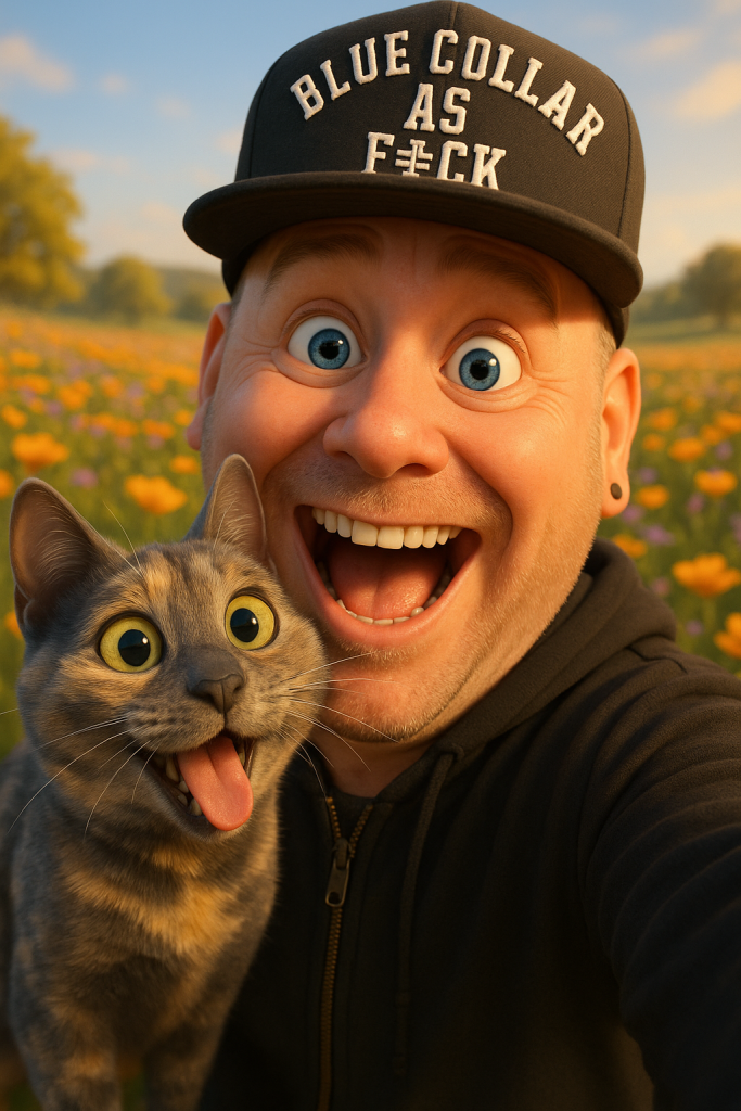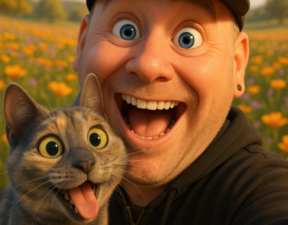 Create an ultra-realistic 3D-style image inspired by Pixar and DreamWorks, with vibrant colors and warm afternoon lighting. Use the provided photos of the person and pet as references, keeping their true faces and natural expressions. Depict them taking a playful selfie together in a flower field, both showing exaggerated surprise and joy, with wide-open eyes and animated smiles. Position the pet close to the person’s face, tongue out and looking friendly. Ensure sharp focus on their faces, with a softly blurred background that conveys natural movement. Output should be vertical (9:16) and high-resolution.