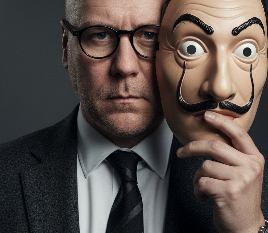 The lighting is discreet, dramatic, and shifting, emphasizing the dark suit and the pale mask against a plain dark grey background. This contrasts the tension between the man’s identity and the mask, capturing a high-stakes, suspenseful mood, typical of a dramatic promotional poster for the TV show. Keep my face exactly the same as the uploaded photo.