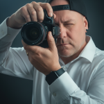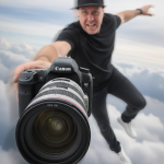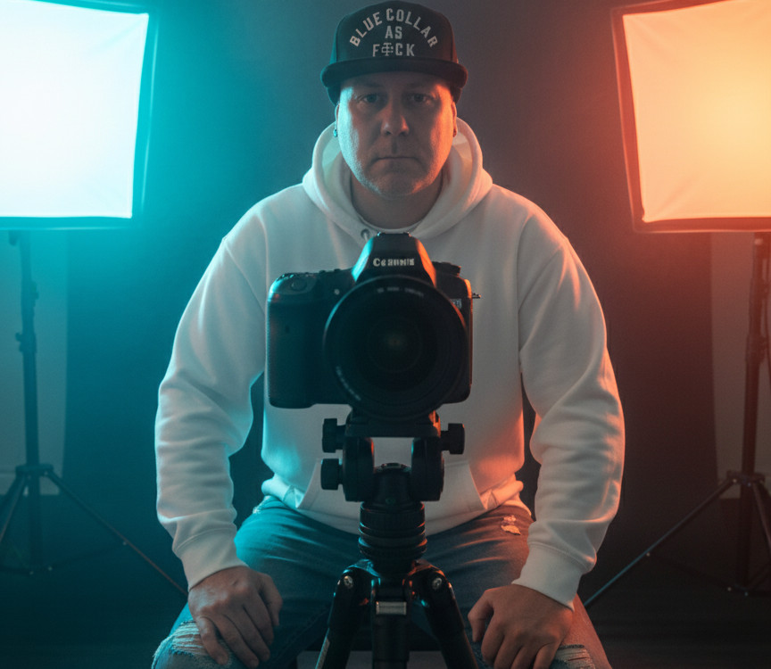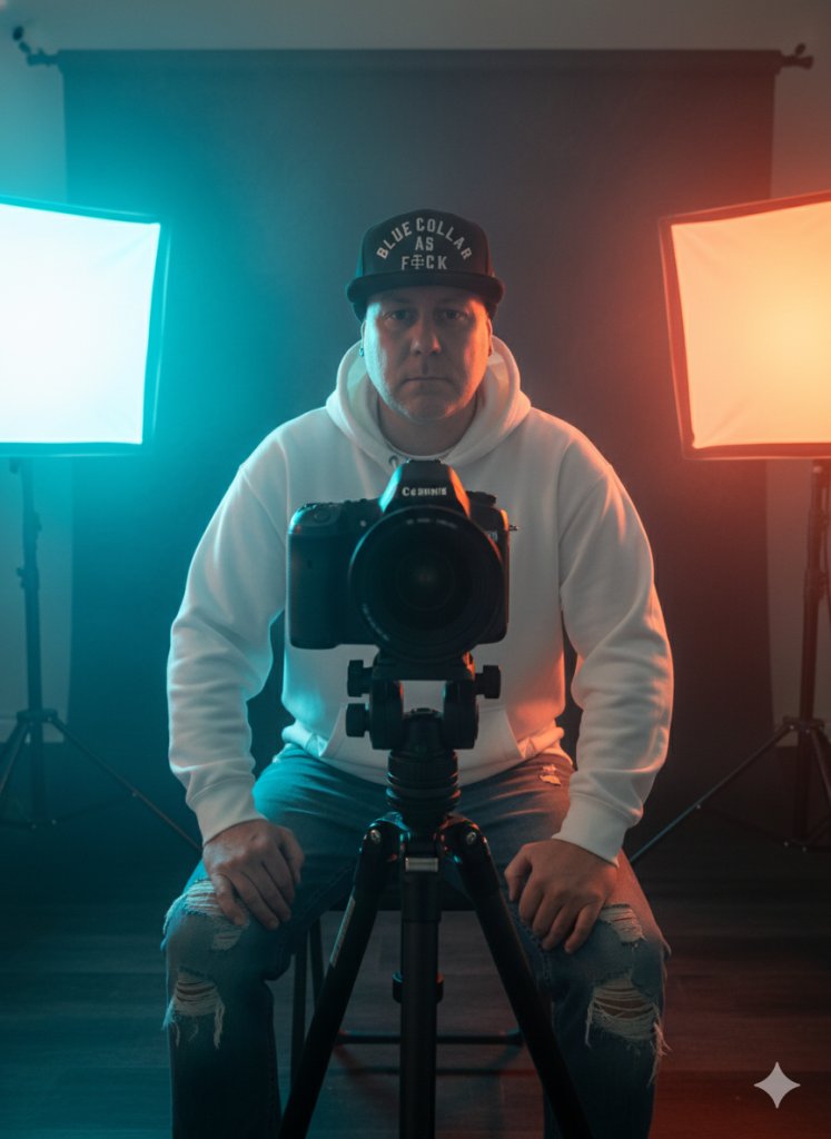 Face unchanged from uploaded image, create an 8K ultrarealistic hyper-ultra-realistic HDR cinematic portrait of the same man, preserving 100% identical facial features, skin tone, age, eyes, nose, lips, jawline, ears, shaved bald head, and overall identity with zero alteration. Male with the same long braids, same facial structure and expression; looking directly into the camera with a focused, intense, confident cinematic mood like a filmmaker preparing for a shot. Outfit: oversized white hoodie with soft realistic folds, distressed ripped jeans with rugged texture, black cap with identical embroidered text. Foreground gear: professional DSLR camera mounted on a sturdy tripod directly in front of him, large lens facing the viewer with sharp glossy metallic reflections. Pose: seated on a studio bench or low chair, leaning slightly forward with hands near his knees, positioned directly behind the tripod-mounted camera. Environment: professional cinematic video studio with atmospheric smoke. Background: two large softbox lights behind him — left side bright cyan, right side warm orange/red - creating dramatic dual-tone rim lighting. Floor: dark studio floor with subtle reflections of the colored lights. Quality: 8K hyper-HDR ultrarealistic detail showing hoodie texture, skin pores, lens reflections, and smoke depth. Lighting: strong cyan rim-light from the left and strong orange rim-light from the right for a bold contrast. Atmosphere: thick cinematic fog blending both colors, enhancing depth and mood. Vibe: high-end filmmaker promotional portrait, bold and dramatic.