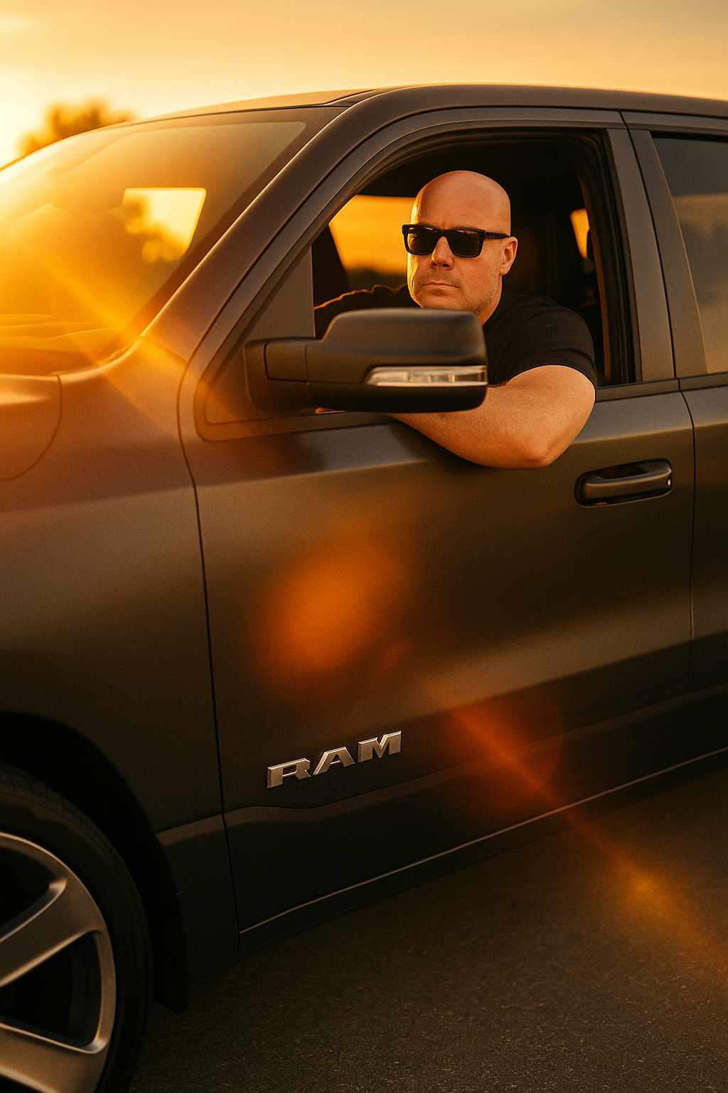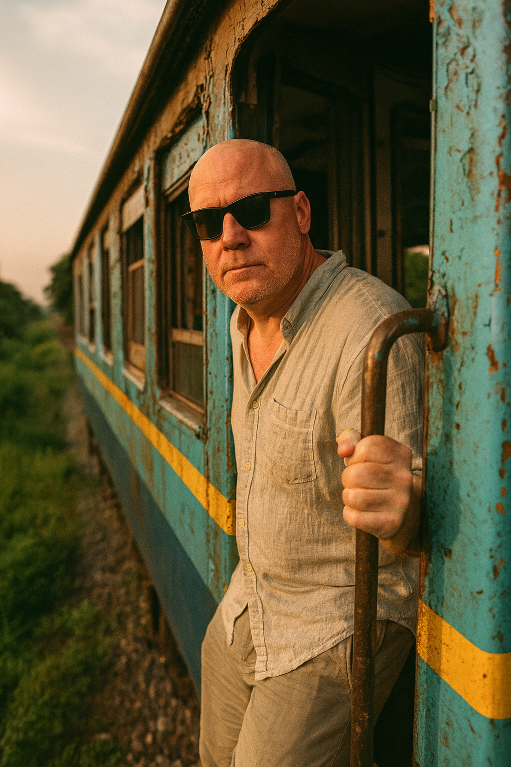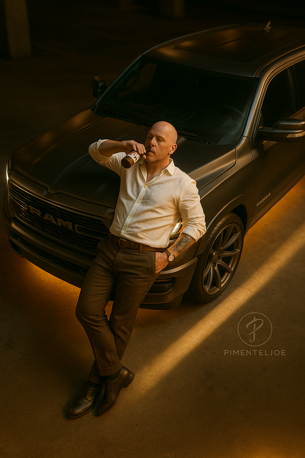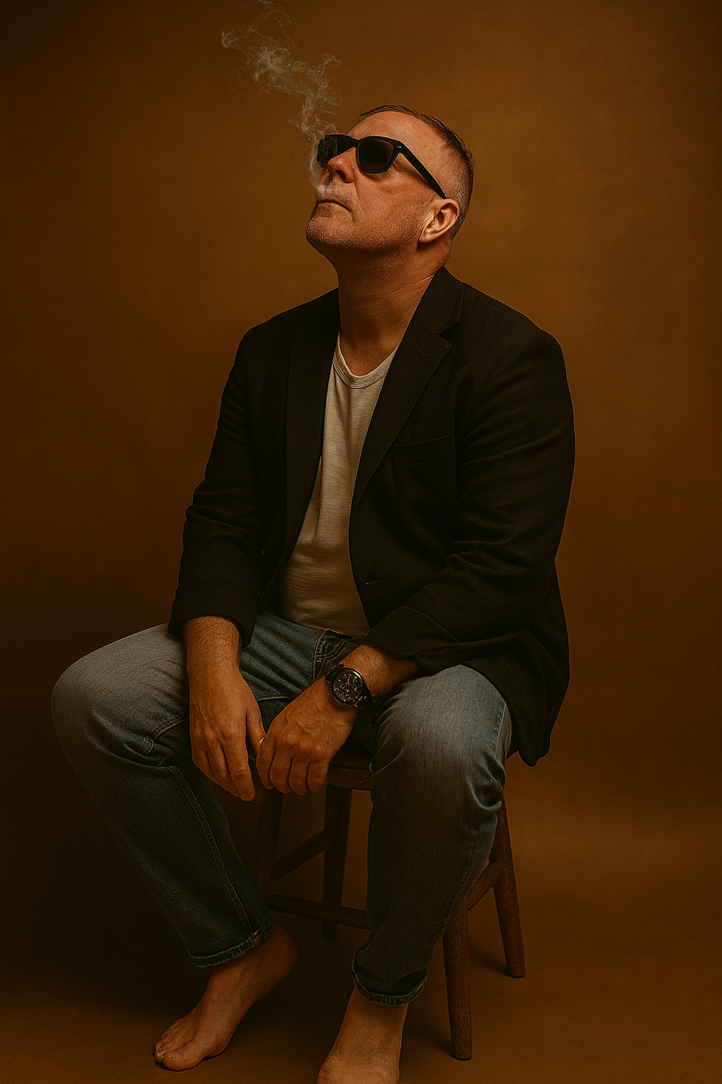 A cinematic portrait of a man sitting barefoot on a wooden stool in a studio with a warm brown monochrome background. He is wearing black sunglasses, […]