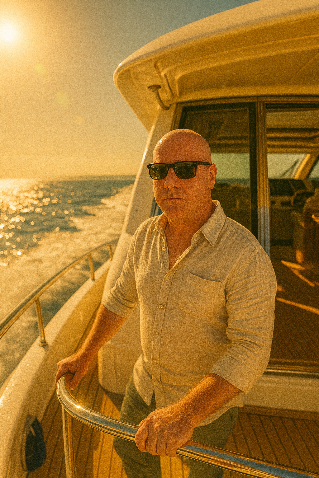Cinematic wide shot of me standing confidently at the helm of a luxurious white yacht cruising through calm blue waters. I’m wearing a light linen shirt […]