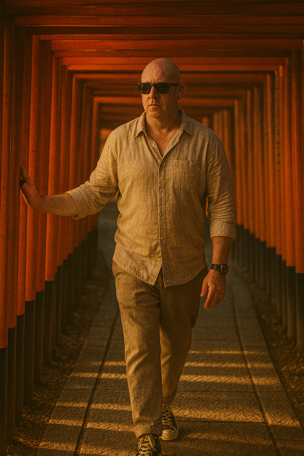 Cinematic shot of man walking slowly through a long tunnel of traditional red torii gates in Japan, surrounded by warm light and deep shadows. I’m dressed […]
