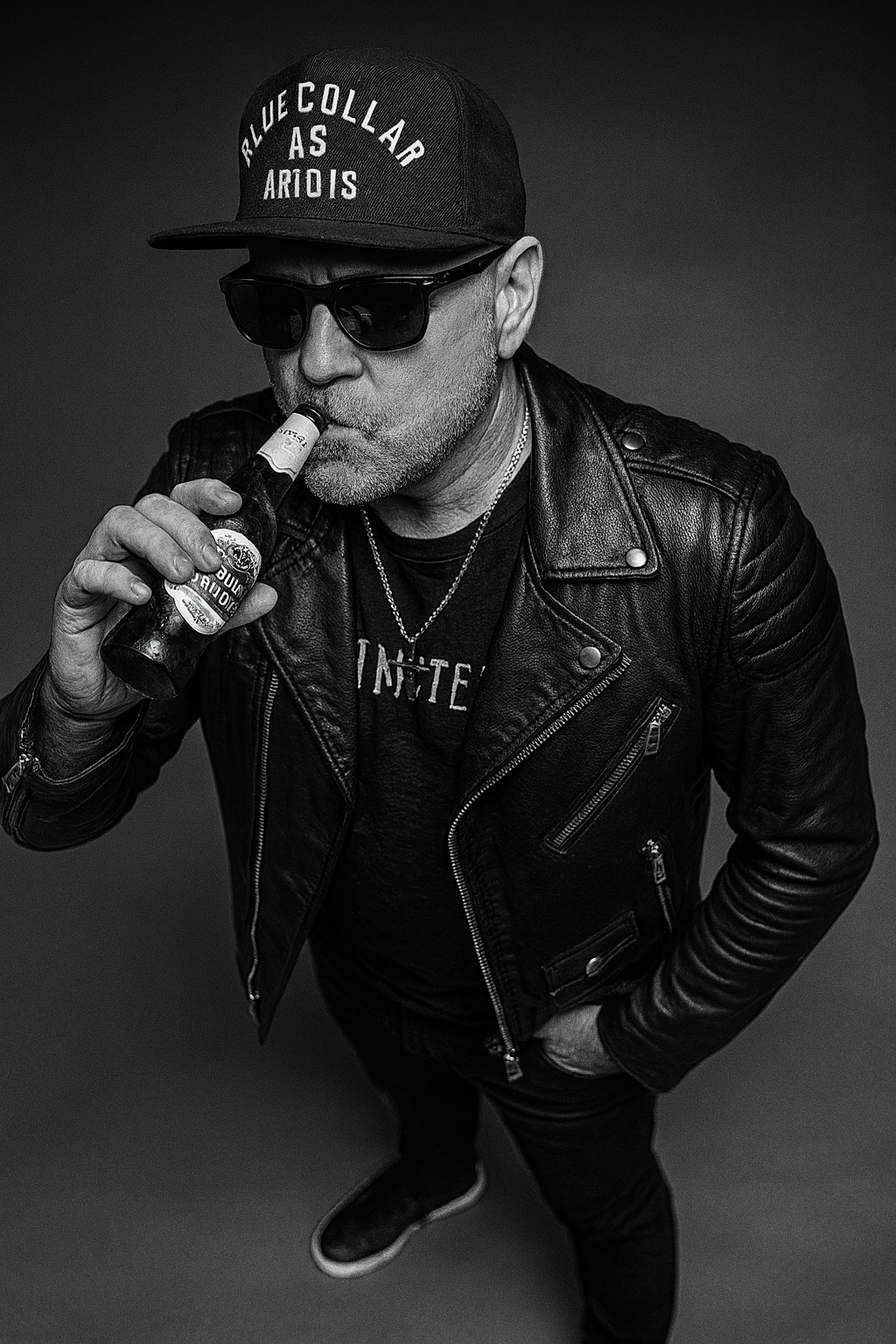 Man dressed in a fitted black leather biker jacket with metallic zippers, a slim black t-shirt, slim black pants, and sleek black sneakers with white soles. […]