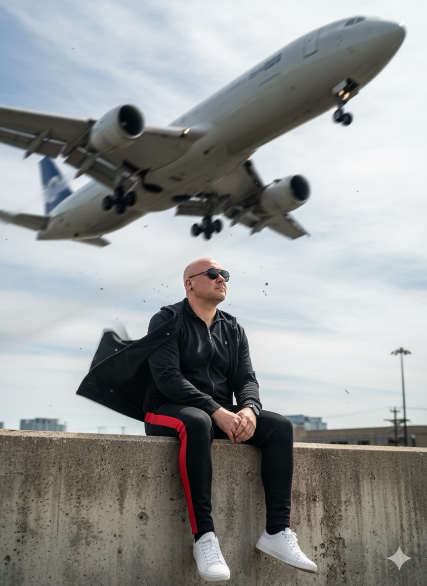 Ultra-realistic cinematic portrait of a man (preserve exact facial features of reference), wearing black sunglasses, black jacket, slim black track pants with red stripes, and white […]