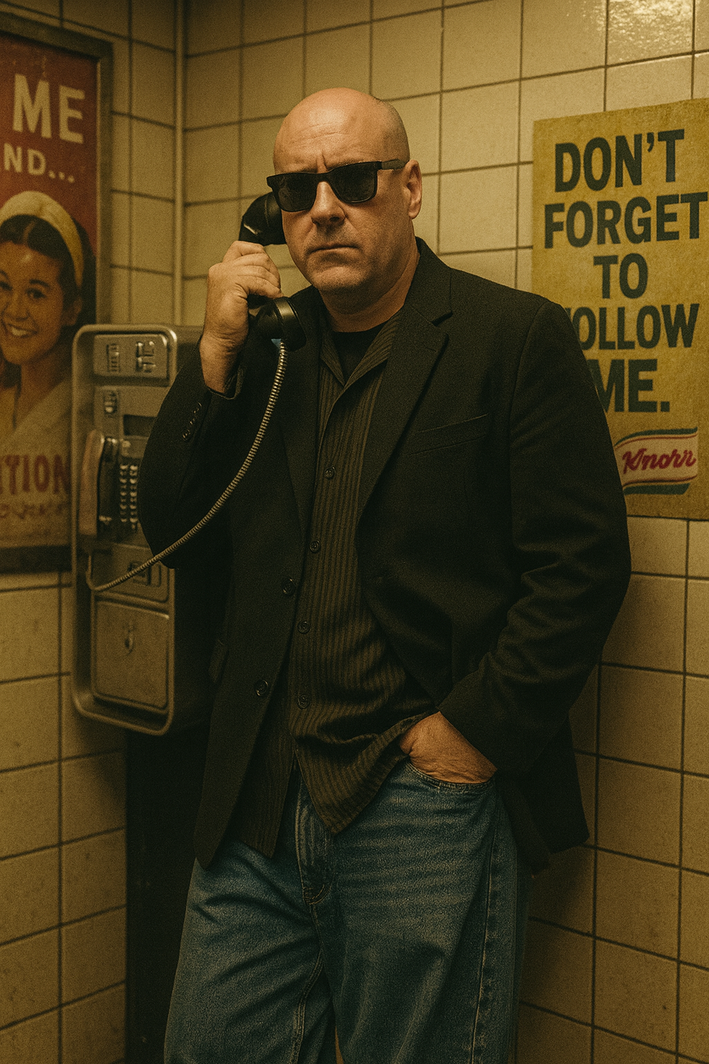 Generate a cinematic image of me standing at a payphone in a retro subway station, leaning casually against the booth while holding the receiver to my […]