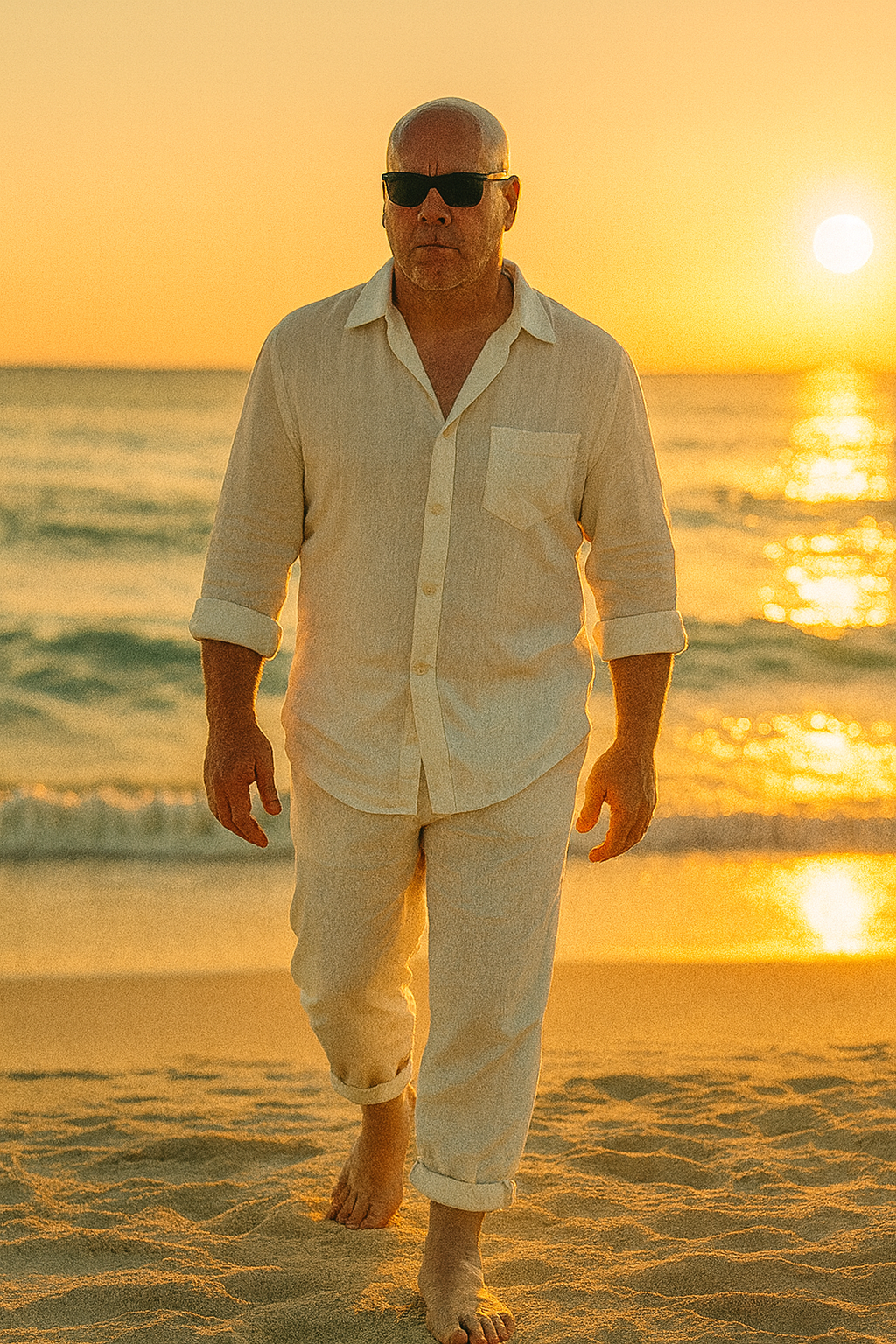 High-contrast cinematic shot of me walking barefoot on a sunlit beach at golden hour. Wearing loose white linen shirt and rolled-up pants and black sunglasses. clean […]