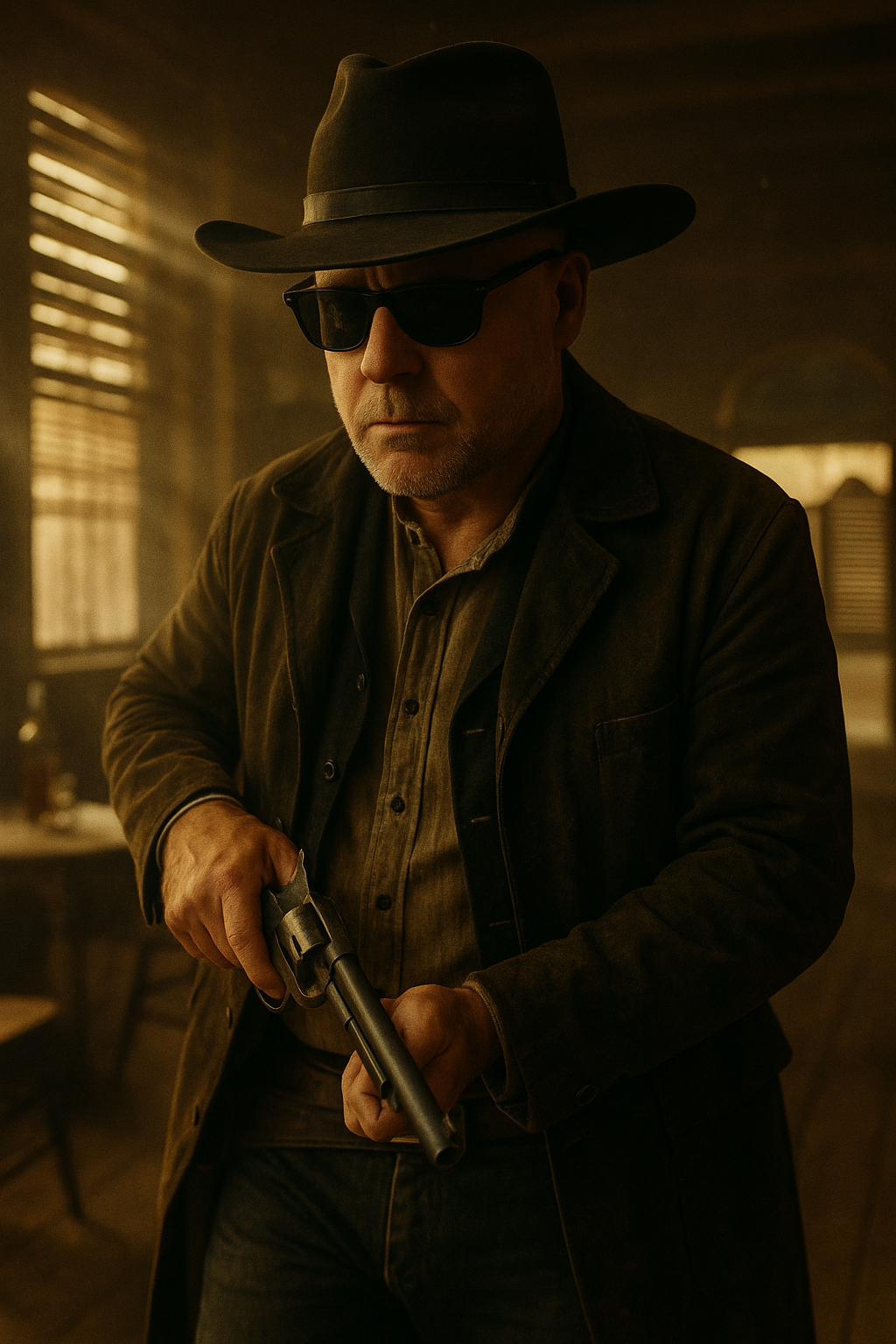A cinematic frame capturing a weathered cowboy mid-draw in an old saloon, sunbeams piercing through wooden blinds. Medium angle shot and classic 35mm film grain, evoking […]