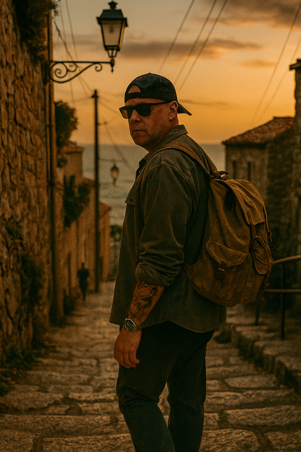 Hyper-realistic 8K vertical (9:16) shot of a young man walking down a narrow rocky staircase street at golden hour. He looks over his shoulder, wearing a […]
