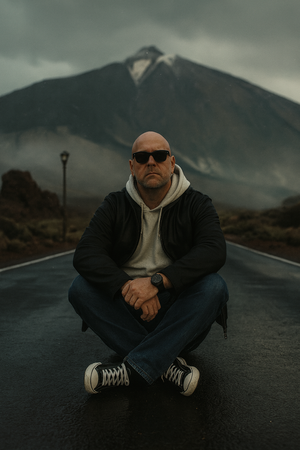Cinematic wide-angle shot of me sitting cross-legged in the middle of a deserted, slightly wet mountain road. The asphalt is dark with patches of moisture reflecting […]