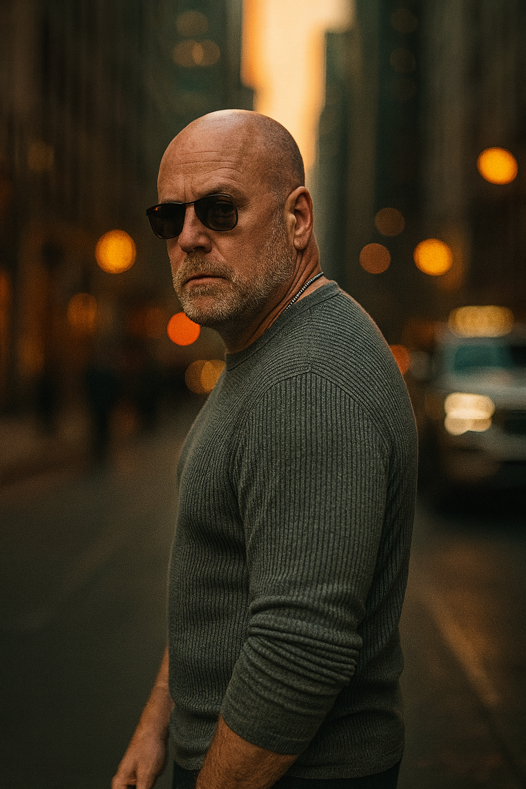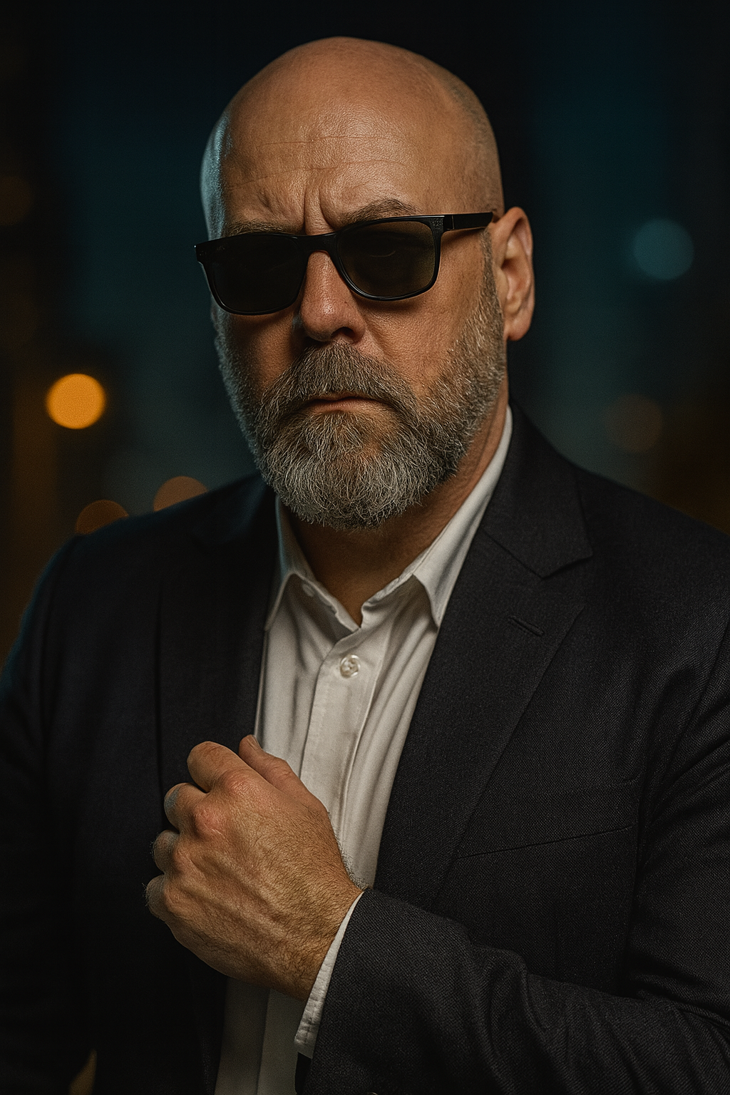 A powerfully composed portrait of a middle-aged man with a full, thick, predominantly gray stubble beard, neatly groomed and slightly wavy. His bald head is slighty […]