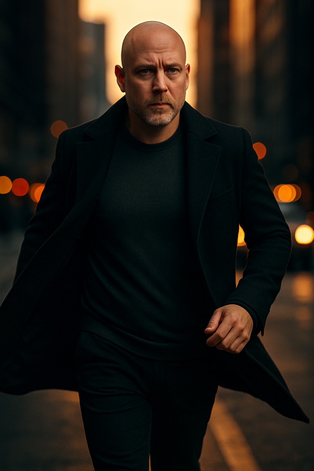 Portrait of me walking forward with purpose, wind catching my coat, urban city street in the background, cinematic lighting, focused eyes, power in every step - […]