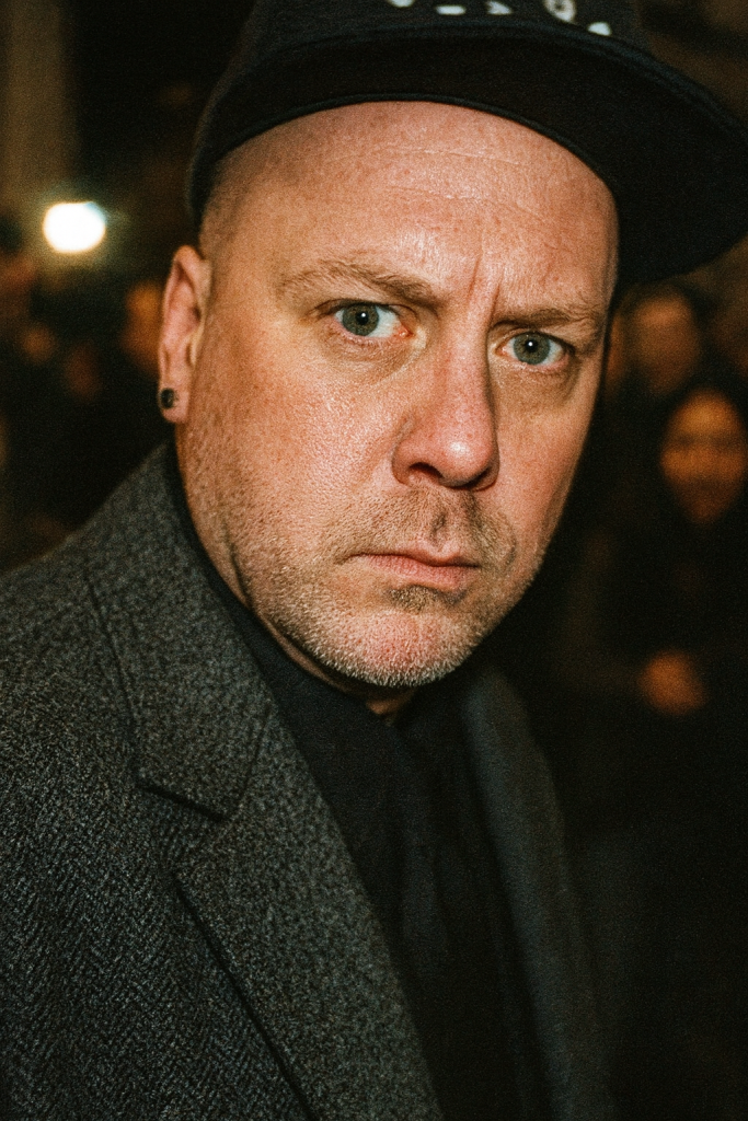 October 3, 2025Paparazzi style close-up shot, caught off-guard moment, man, as pictured in reference photo, with striking features. Shaved head, clean cut, same face. turning toward camera, extreme close-up face and shoulders, motion blur crowd, grainy high ISO photography, harsh flash lighting, raw candid energy, wearing designer grey coat, street style fashion, shot from below angle, Paris Fashion Week vibe --ar 4:5 --s 250