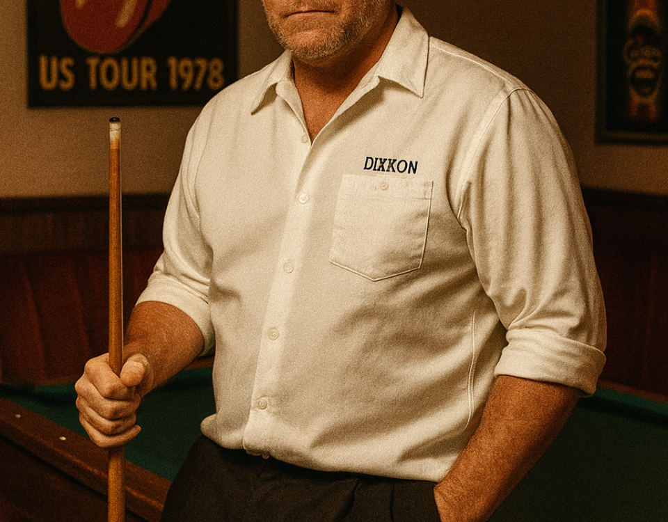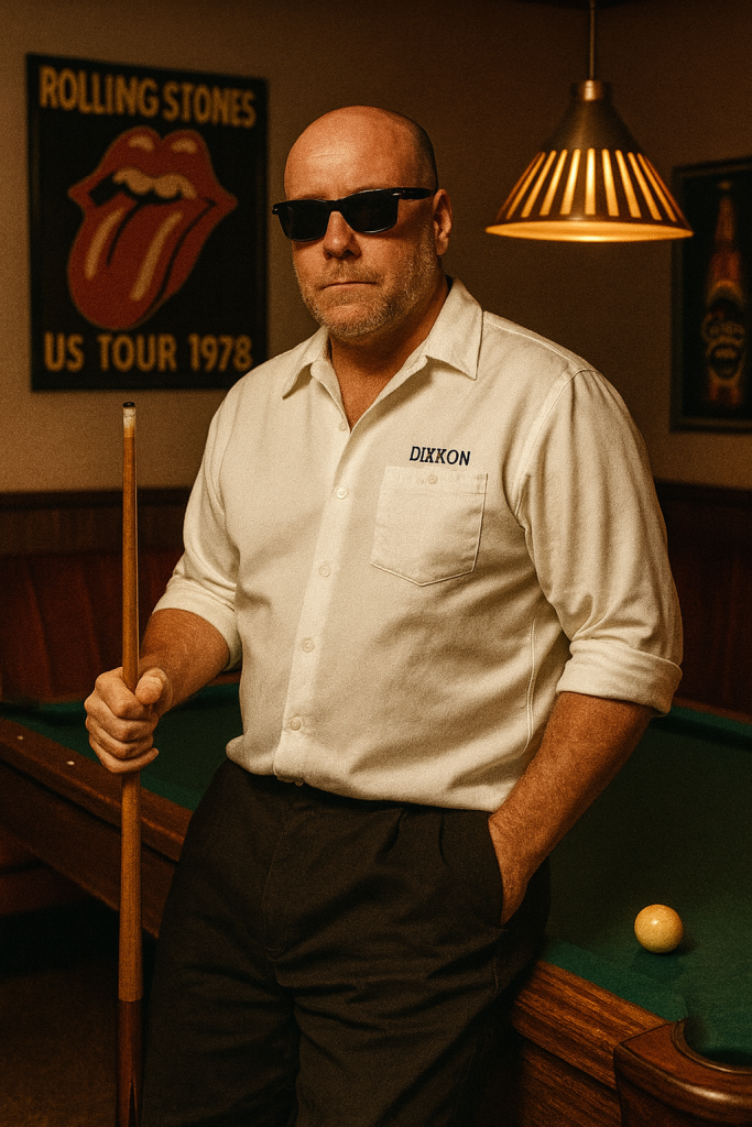 September 7, 2025A man sits casually at the edge of a pool table in a retro-style room. He wears black sunglasses, a white Dixion shirt with rolled-up sleeves and loose-fitting black pants. His face is defined by a calm and charismatic expression. He holds a pool cue in one hand and has the other in his pocket. The room’s setting is warm and dim, with a dark red sofa, retro posters, and a cone-shaped chandelier. 8k.