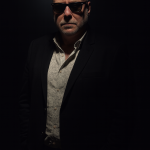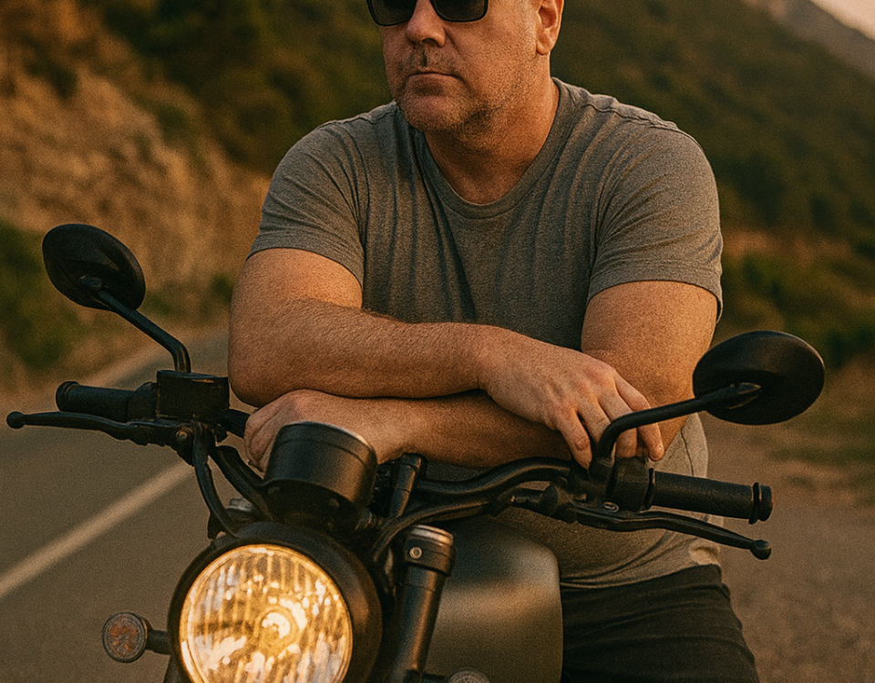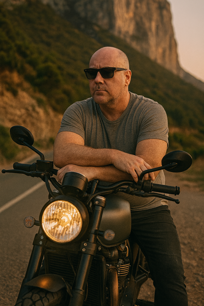 I am leaning casually against my motorcycle, sitting slightly sideways on the seat with my legs apart and my feet firmly resting on the ground. My arms are crossed over the handlebars, resting in a relaxed but confident pose. My head is turned slightly to the left, and my gaze is directed into the distance, wearing a calm and strong expression. I am wearing a light grey fitted t-shirt with rolled-up sleeves, dark slim-fit jeans slightly worn, and black boots. The motorcycle is a modern retro style bike with a round front headlight and visible details in matte black and metallic tones. The scene is set on a winding mountain road with a rocky hill and green vegetation in the background, and a large cliff rising behind me. The camera angle is at eye level, slightly from the front, capturing me and the motorcycle as the main subject. The perspective resembles a portrait lens, around 85mm focal length, with natural evening light casting warm tones and soft shadows, emphasizing the rugged and adventurous mood of the scene. Same face.