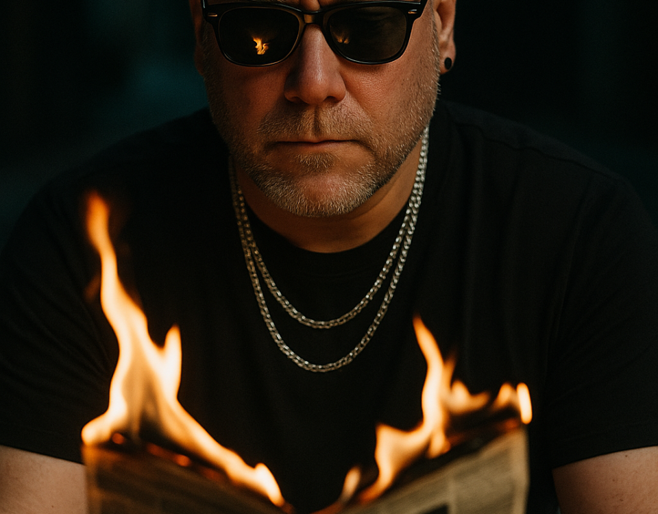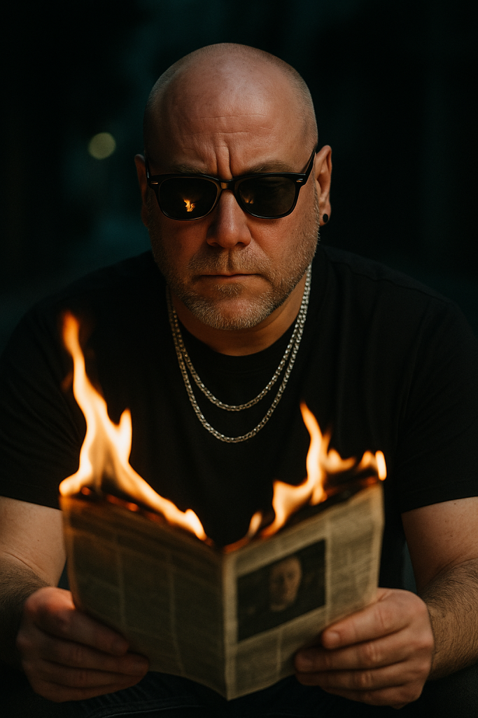 September 6, 2025Subject should wear black sunglasses, a black shirt and layered silver chains for a bold, modern look. The expression should be serious and contemplative as the person looks down at the burning newspaper. The atmosphere should be intense and mysterious. Replace the face with the person from the uploaded photo, matching the lighting, skin tone, and perspective realistically. Keep the image high quality and photorealistic.