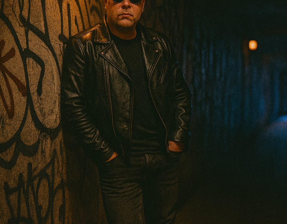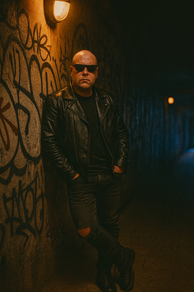 Cinematic portrait shot of a man leaning casually against a graffiti-covered wall inside a dimly lit tunnel. He’s wearing black sunglasses, a black leather jacket, dark jeans with ripped knees, and black boots. One leg is bent, sole resting against the wall, hands in pockets. The lighting is moody and dramatic, coming from a single warm-toned wall light above him, casting deep shadows and highlighting the texture of the wall and graffiti. The rest of the tunnel fades into darkness with subtle blue and purple tones in the distance. 35mm film aesthetic, shallow depth of field, gritty urban atmosphere.