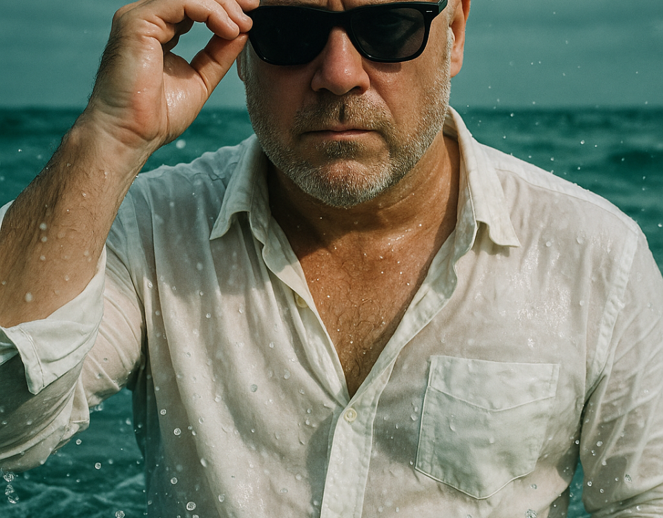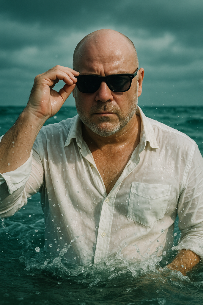 September 6, 2025Cinematic portrait of a man standing waist-deep in the ocean, wearing a soaked white shirt and black sunglasses. He is adjusting his black sunglasses with one hand while water splashes around him. Overcast sky and moody teal tones in the sea and atmosphere. Wet hair, confident expression, and soft lighting on the face. Realistic water texture with droplets in motion. Slightly desaturated color grading with high contrast. Shot with shallow depth of field.