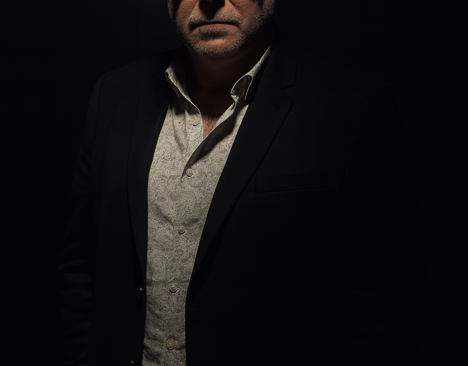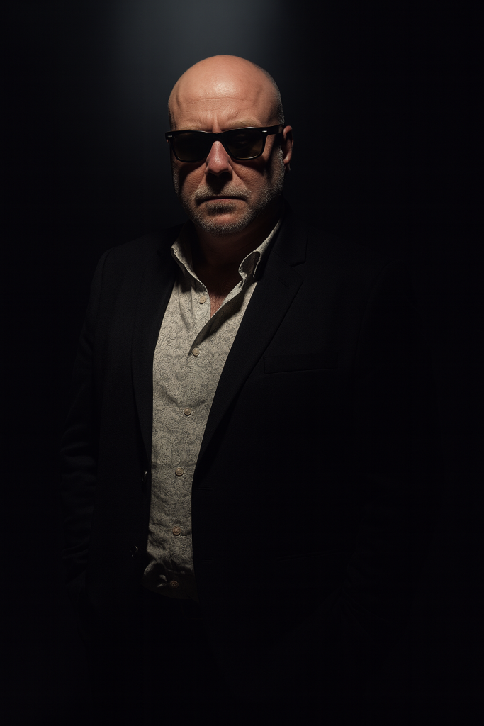 A dramatic spotlight in a dark room highlights the same face as the uploaded image. The man wears a patterned white shirt with a black suit and sunglasses, exuding a confident, intense expression. His hands are in his pockets, and the lighting casts deep shadows that define the contours of his face and body. The background is black. Create a realistic image.