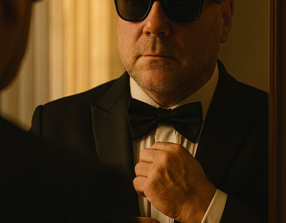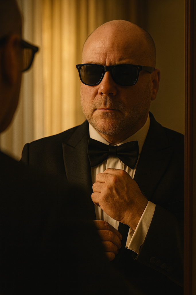 A man in a sharp black tuxedo, adjusting his tie in front of a mirror with a calm and confident expression. Wearing black sunglasses. The scene is warmly lit with golden ambient lighting from behind the sheer white curtains, creating a soft, cinematic atmosphere. The mirror reflection shows only the back of his head and shoulder, while the main focus is on his front view. Elegant, luxurious setting, shallow depth of field, high resolution, professional studio look.” 8k resolution.