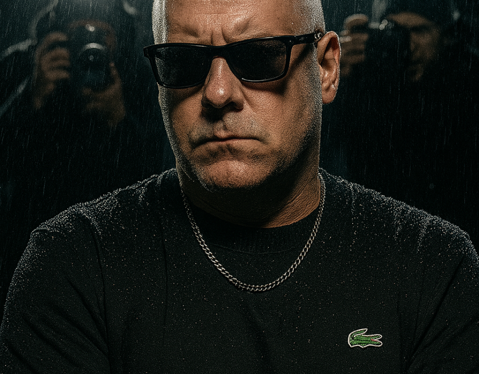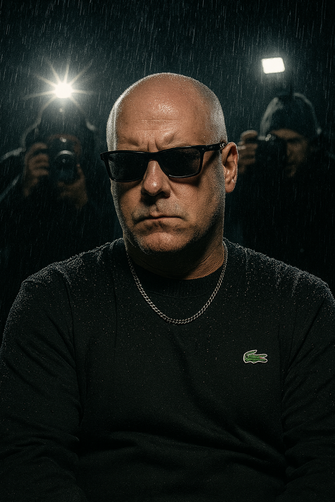 A stylish man with sucked-back wet hair and a sharp jawline sits confidently in the rain under bright lights. He is wearing black rectangular sunglasses, a black Lacoste sweatshirt with the logo visible, and a silver chain around his neck. raindrops glisten on his shoulders, adding a dramatic texture. Behind him, several paparazzi photographers in winter clothing and beanies hold cameras with flashes, capturing his photo. The atmosphere is intense and cinematic with a high-contrast lighting setup. Highlighting the man’s face while rain falls heavily in the background. same face and clean-shaven head