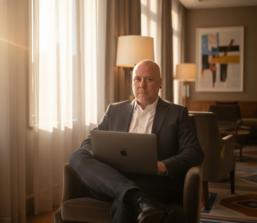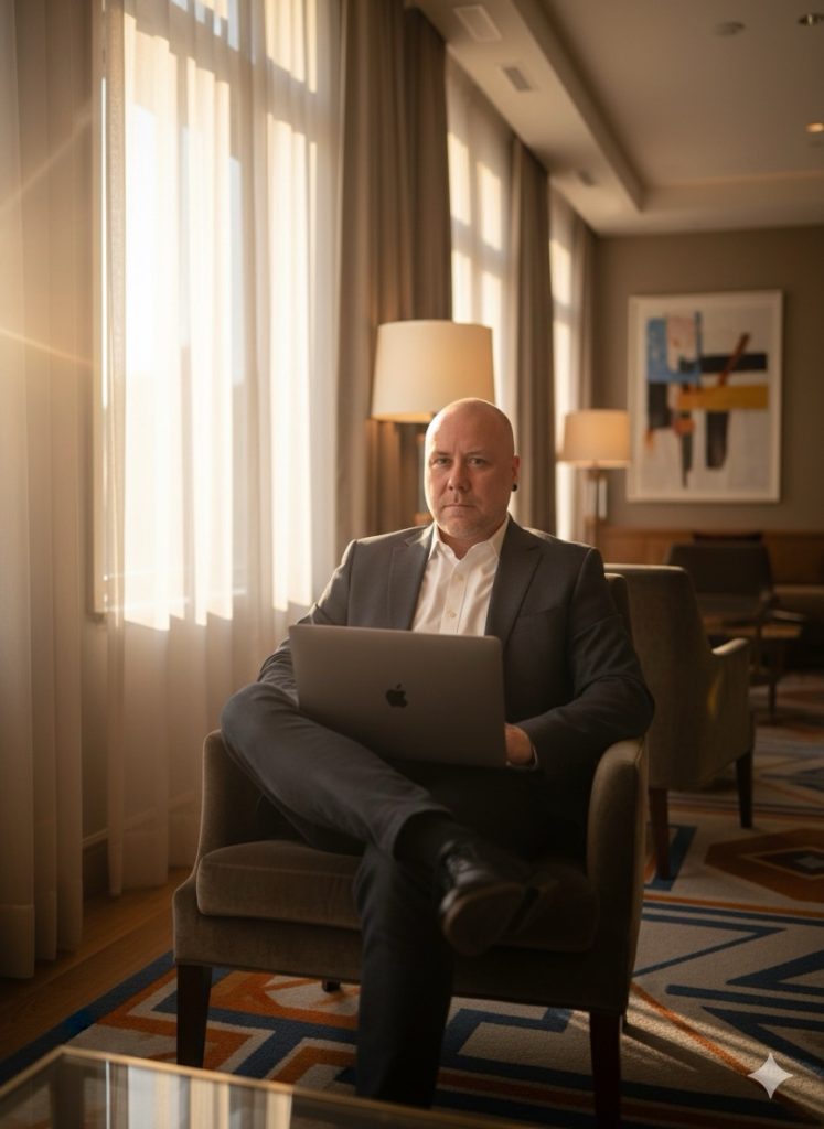 September 7, 2025Sophisticated man shaved head in a tailored blazer, sitting on a velvet armchair in a luxury hotel lounge, MacBook on his lap, legs crossed casually, golden hour light streaming through floor-to-ceiling curtains, elegant interior with art deco elements shot from a lower angle to capture opulence an composure,